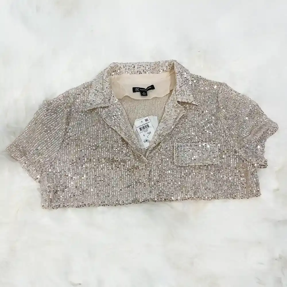 This INC International Concepts top is covered head to toe in silver sequins that catch the light from every angle. The champagne-toned mesh base gives the sequins a warm glow rather than stark silver. The collared neckline adds structure, and the short sleeves keep it polished without being too formal.
