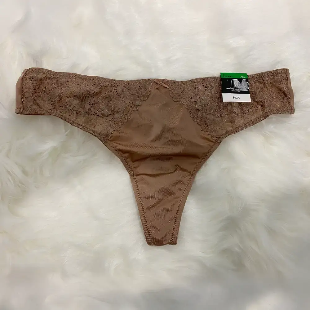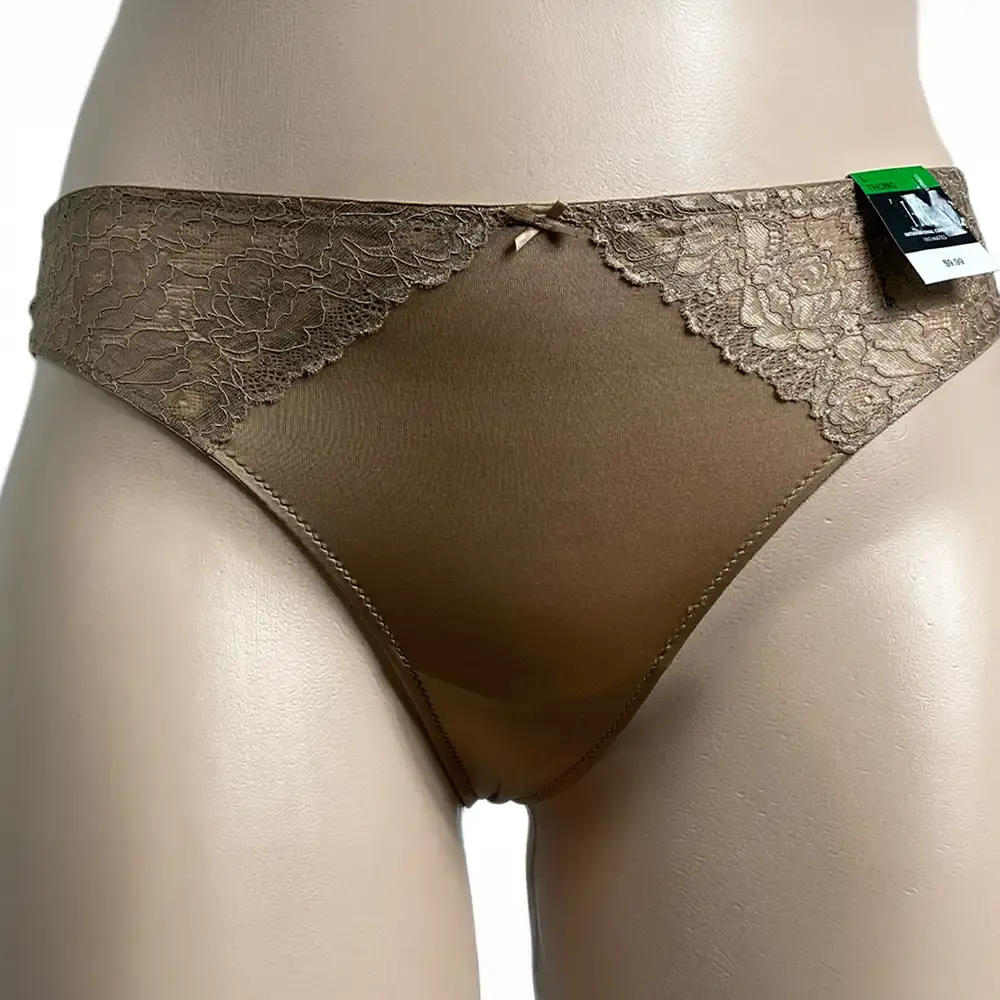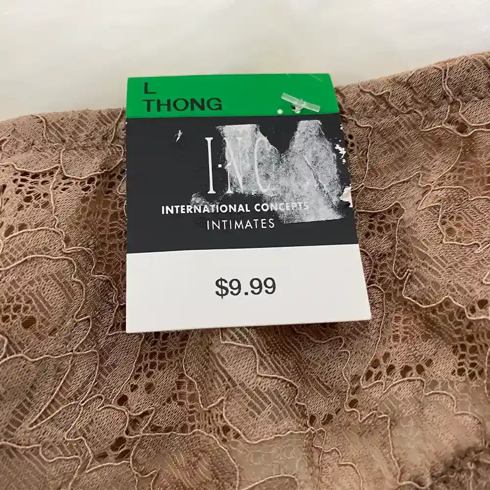 Add sophistication to your intimate apparel collection with this INC International Concepts taupe dream thong. The front features a smooth, seamless nylon construction while the sides showcase beautiful decorative lace detailing. The thong silhouette provides minimal coverage for a sleek and seamless look under clothing. The soft taupe dream color complements all skin tones beautifully. The nylon and spandex blend creates a stretchy, comfortable fabric that moves with your body. This is a reliable piece that works perfectly in your rotation of everyday intimate wear. The lace accents add just the right amount of elegance and sophistication. New with the original tag still attached.