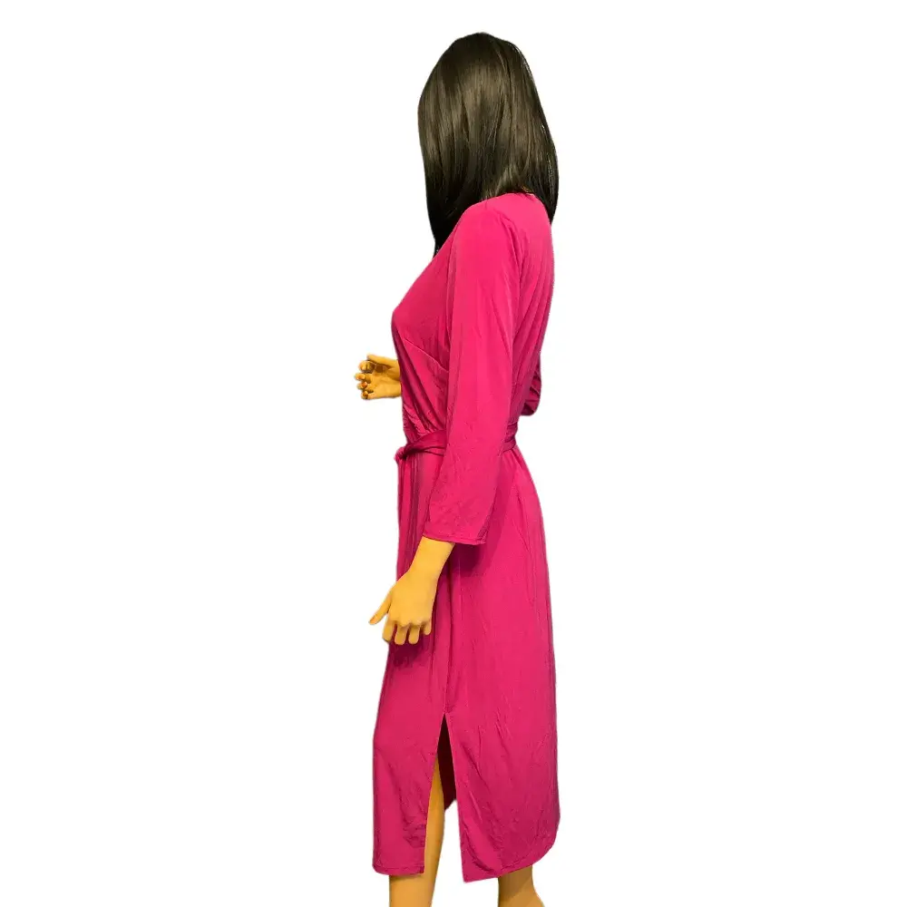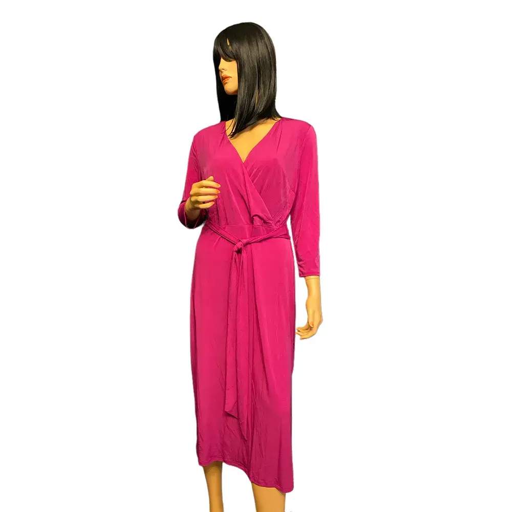 This stunning INC International Concepts dress showcases timeless wrap styling in a gorgeous fuchsia pink that radiates confidence and feminine elegance. The classic surplice neckline creates a universally flattering V-shape, while the wrap front design cinches beautifully at the waist with a matching tie belt. Three-quarter sleeves offer sophisticated coverage with a relaxed fit that moves comfortably. The soft jersey-like fabric with spandex provides gentle stretch and all-day wearability while maintaining a polished silhouette. Side slits allow graceful movement and add modern detail to this versatile midi length. Fully lined for comfort and a luxurious drape. This vibrant shade works beautifully for both daytime meetings and evening events, transitioning effortlessly from season to season. The rich color flatters all skin tones while the adjustable wrap styling accommodates your perfect fit. Brand new with original tags attached.