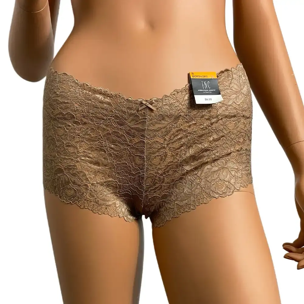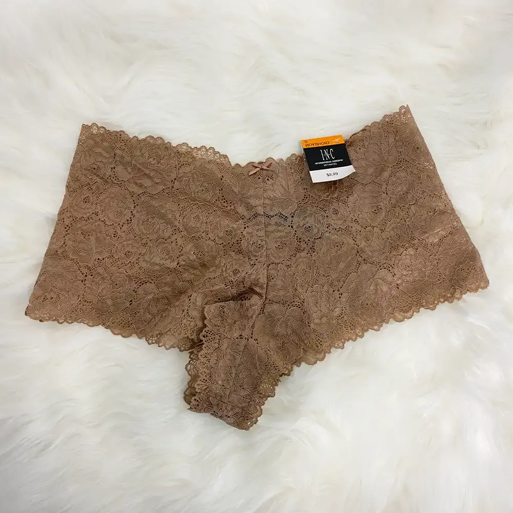 Discover comfort and style with this INC Intimates taupe boy short. The entire garment is crafted from delicate floral lace, offering a feminine and elegant look while maintaining everyday practicality. The boy short silhouette provides fuller coverage than briefs while still offering a smooth, flattering fit. The soft taupe dream color complements all skin tones beautifully. The nylon and rayon blend creates a stretchy, breathable fabric that feels wonderful against your skin. This is a reliable piece that works perfectly in your everyday intimate apparel rotation. The lace texture adds just the right amount of sophistication to basic underwear. New with the original tag still attached.