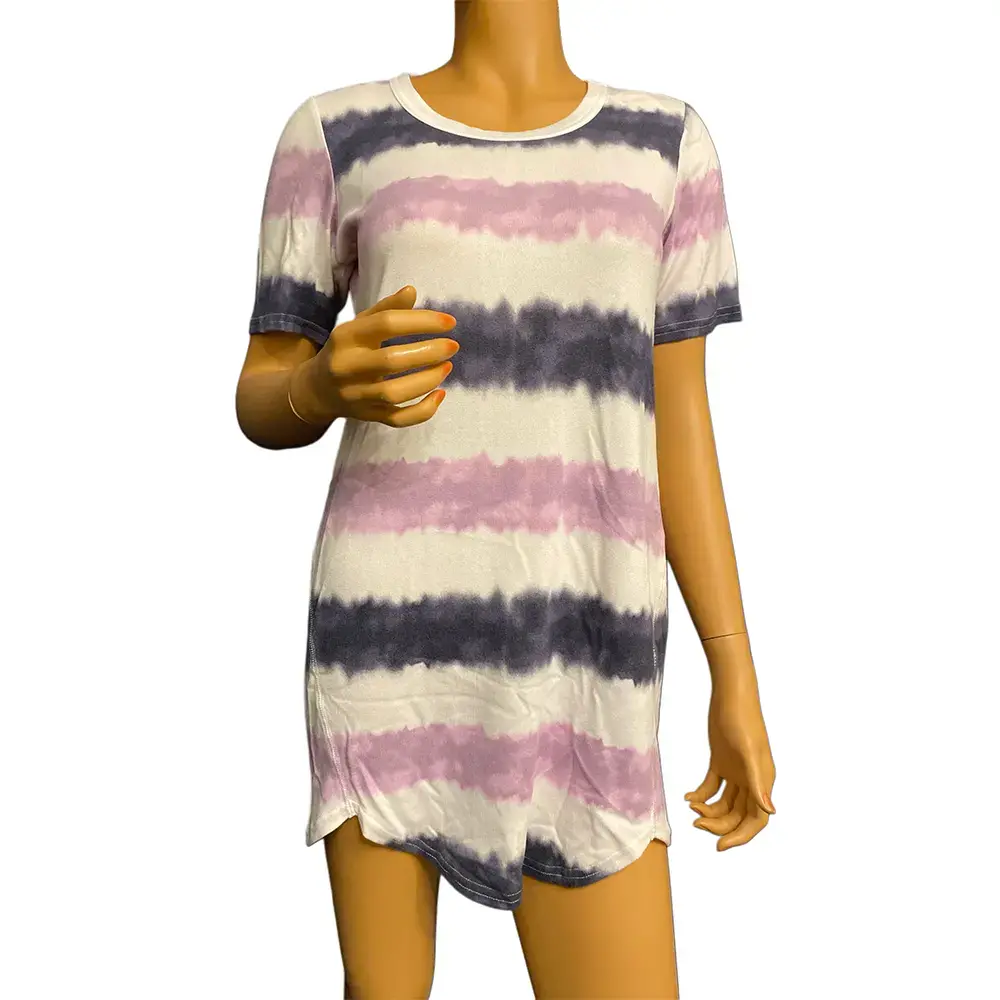 This Jenni Intimates sleep shirt combines comfort and style with a trendy tie dye stripe pattern. The soft pink and purple stripes pop against the white background for a fun, laid back look. Classic crew neckline and short sleeves give it a relaxed t shirt feel. The curved hem and easy pullover styling make it perfect for lounging or sleeping. Stretchy polyester blend fabric is lightweight and moves with you. Store return in excellent condition with no flaws.