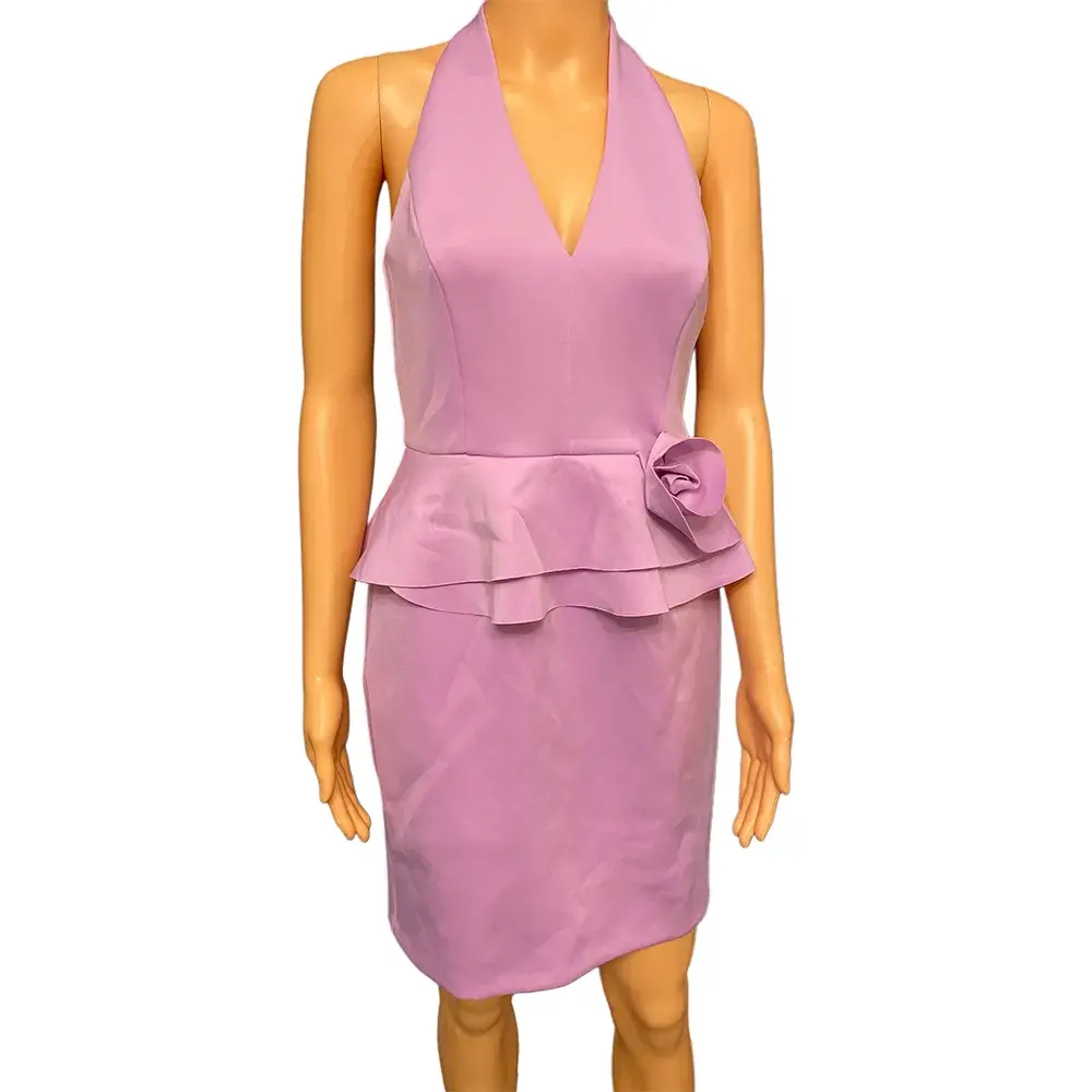 A cocktail dress in structured scuba fabric with a soft orchid pink color. The halter neckline with deep V keeps things sophisticated while the tiered peplum at the waist adds dimension. A rosette detail at the side of the peplum gives it a feminine touch without being too fussy. The scuba material holds its shape and smooths everything out.