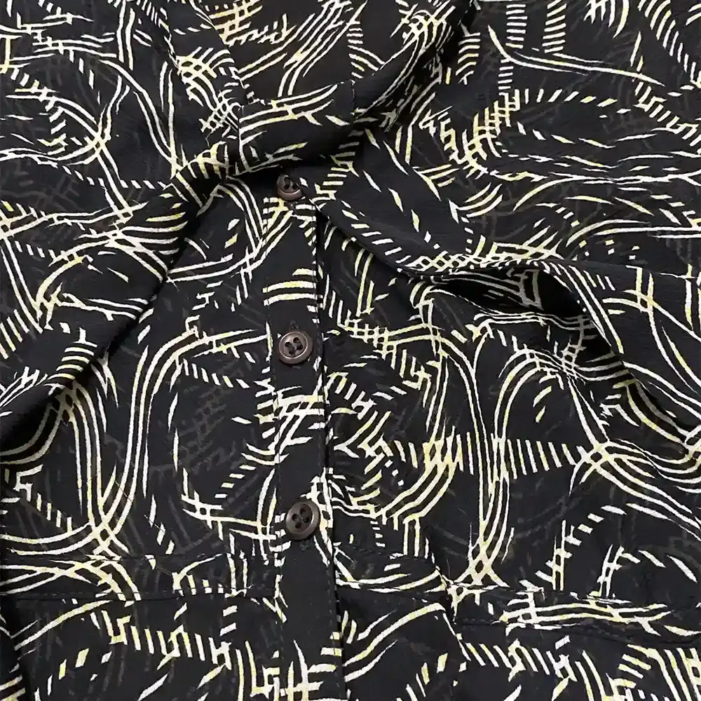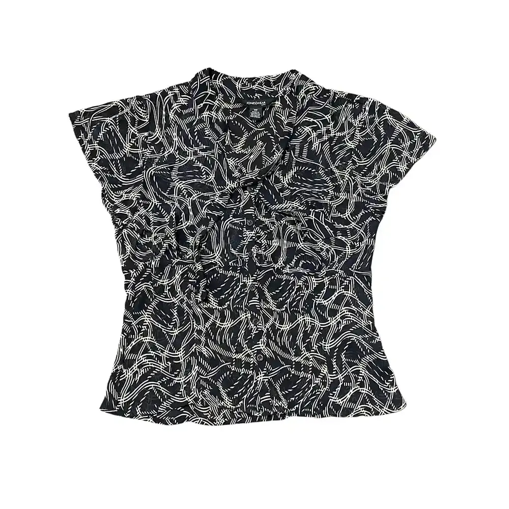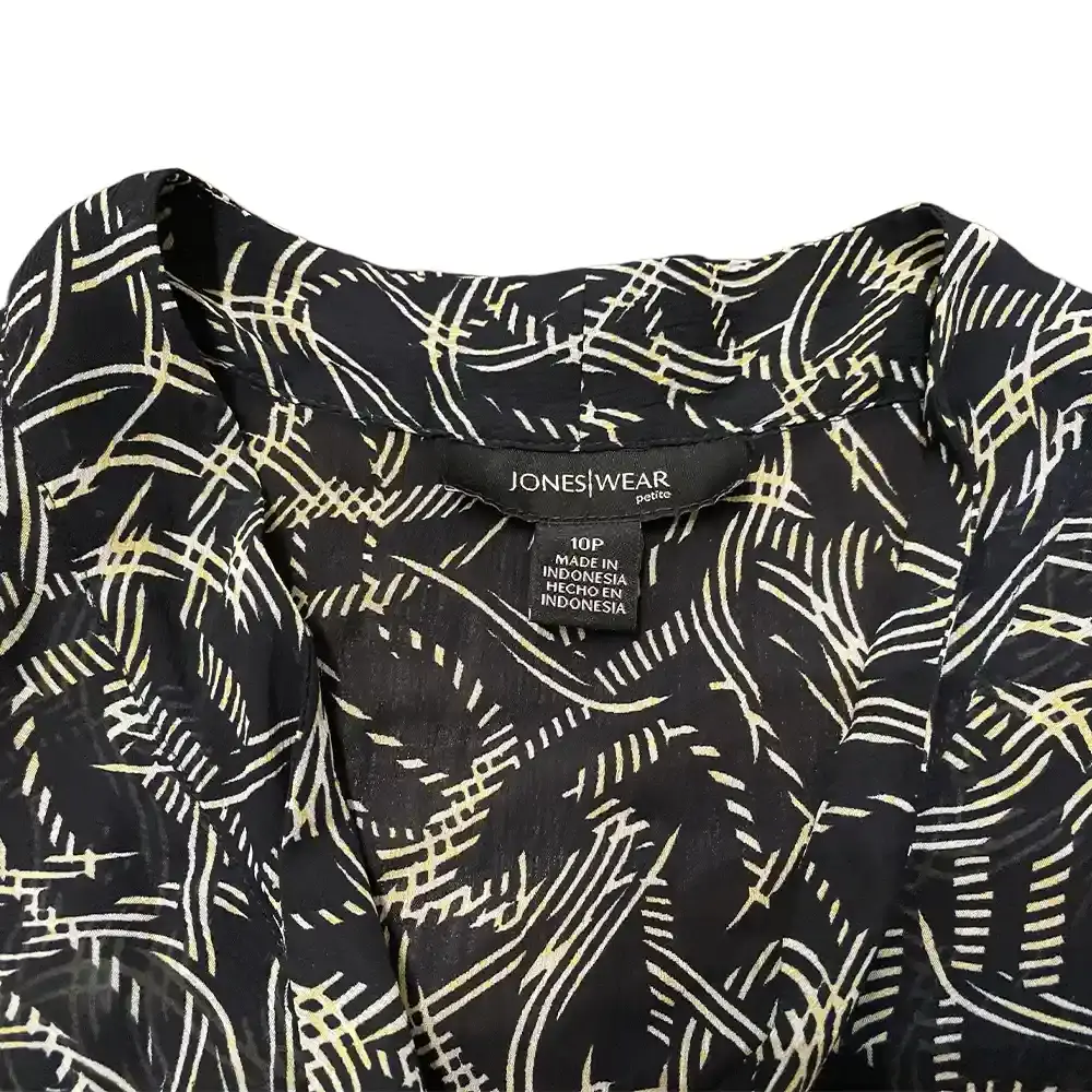This Jones Wear petite blouse is an easy way to dress up jeans, trousers, or a skirt without sacrificing comfort. The lightweight woven fabric features an abstract snakeskin inspired print in soft neutral tones over a black background, giving it a modern look that works for the office, dinner, or weekend events.