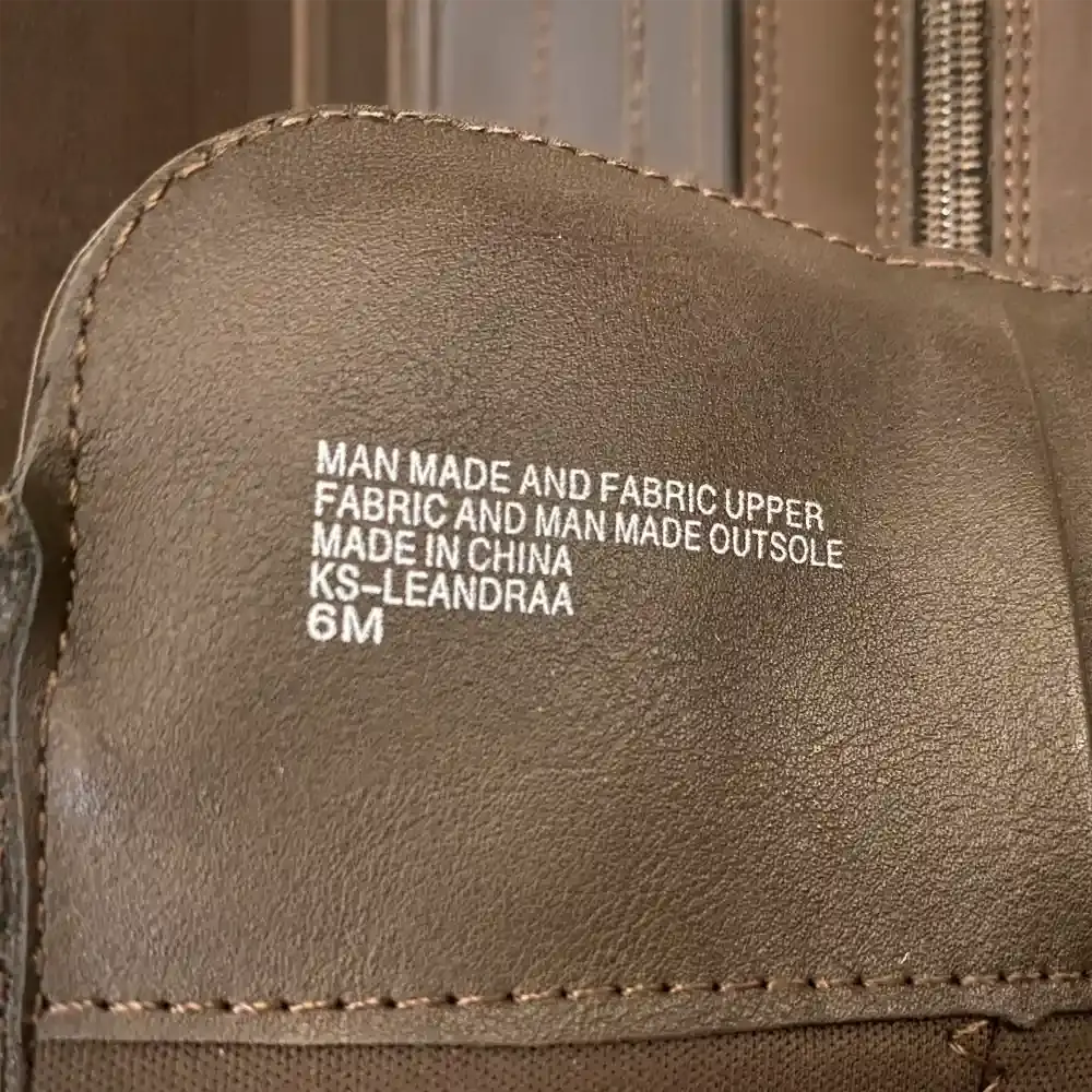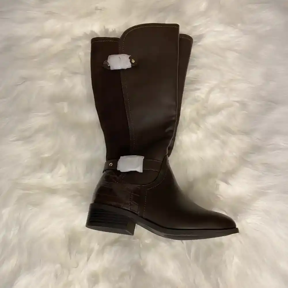 These Karen Scott Leandra riding boots have classic equestrian style with modern mixed material details. The knee high silhouette features smooth dark brown faux leather on the front and a soft suede textured back panel. Croc embossed detailing wraps around the ankle area for added visual interest. Gold tone buckle hardware at the ankle and calf adds a polished touch. Elastic gore panel on the inner side provides flexibility for easy on and off. Full side zipper closure with gold pull tab. Low stacked heel for comfortable all day wear. Brand new without box, never worn with pristine soles.