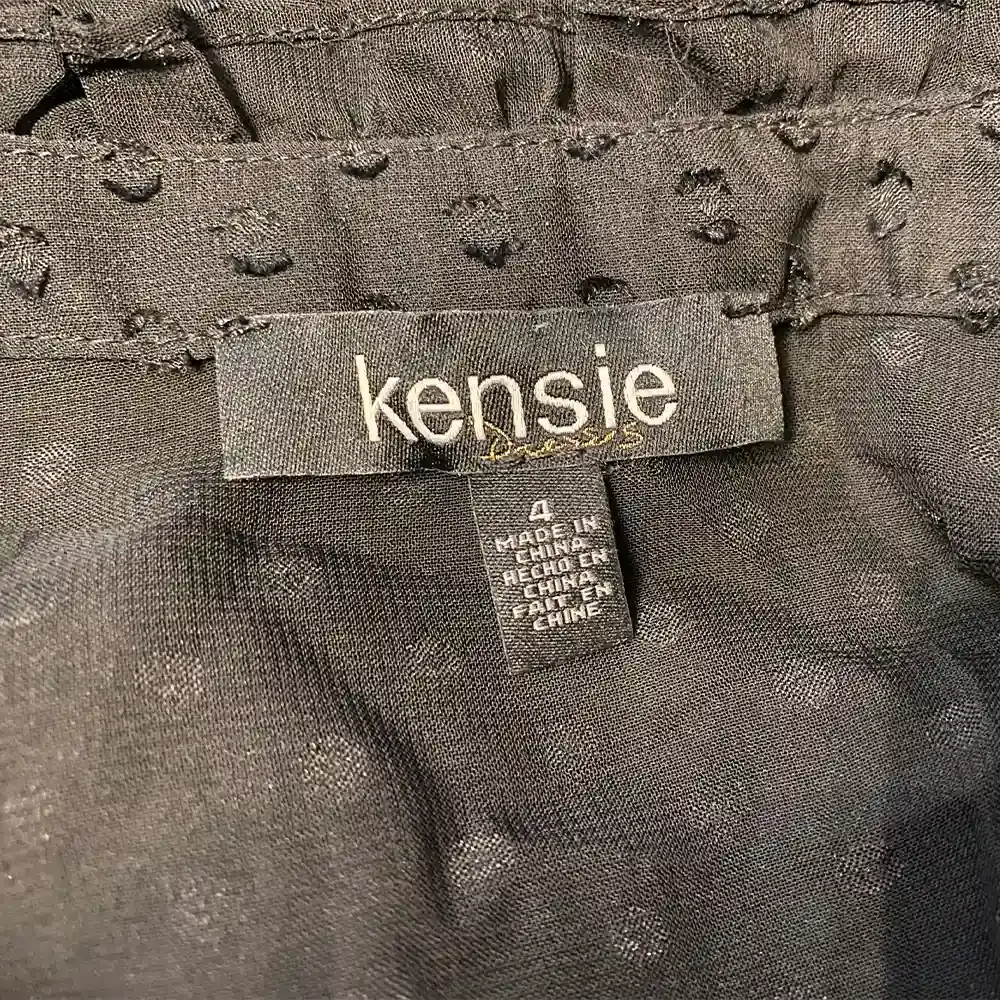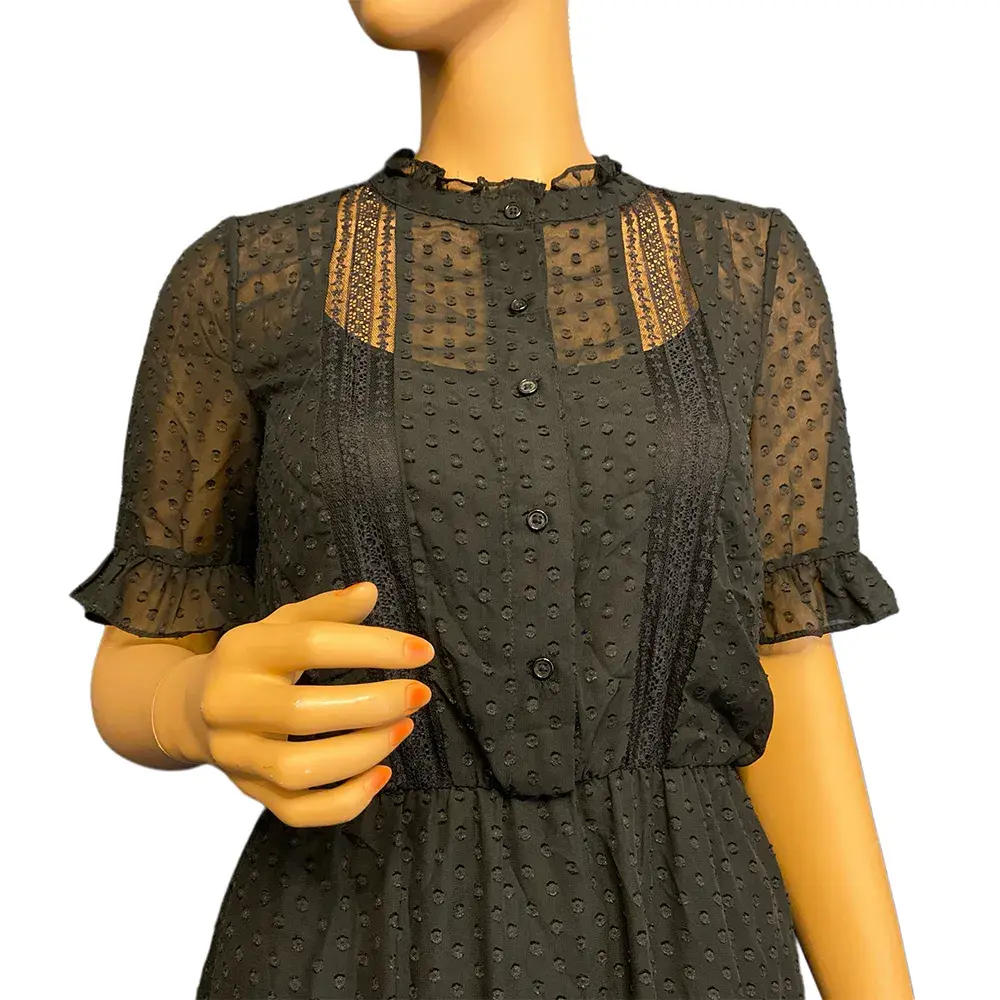 This Kensie dots chiffon midi dress brings soft drama to any occasion. The black chiffon overlay is sprinkled with textured dots that add subtle dimension without feeling busy. A sheer yoke with delicate lace inspired inset panels frames the neckline, while the sheer short sleeves finish in gentle ruffles for an airy, romantic touch.