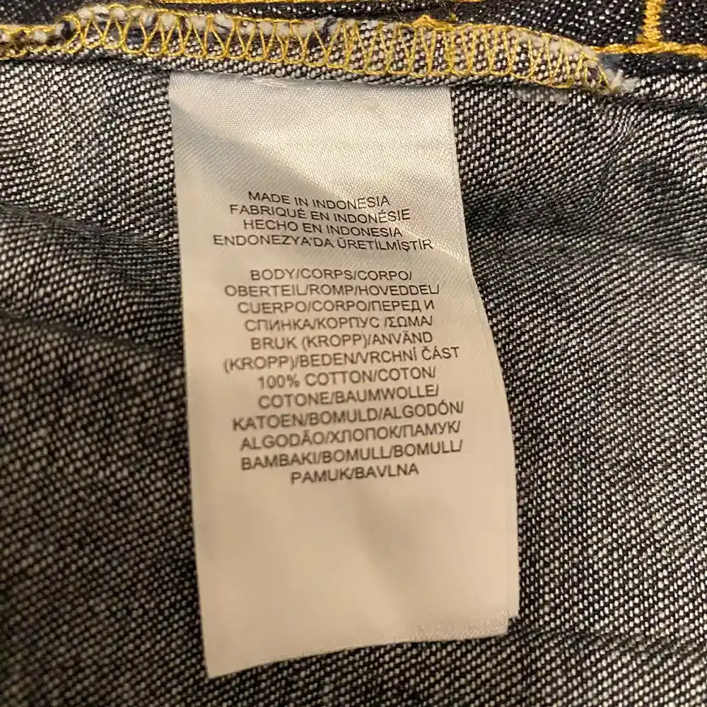 - Color: Dark blue denim with contrast stitching