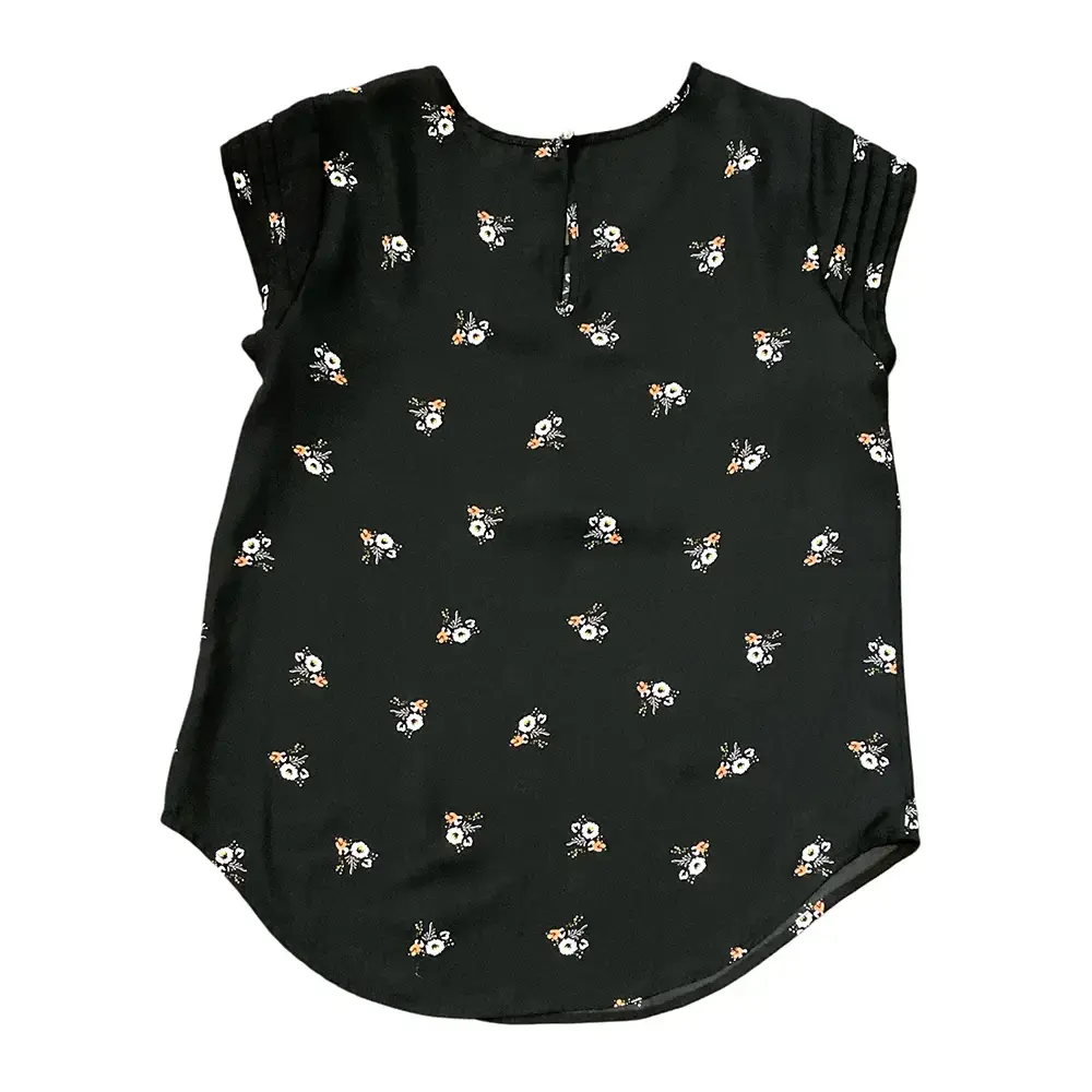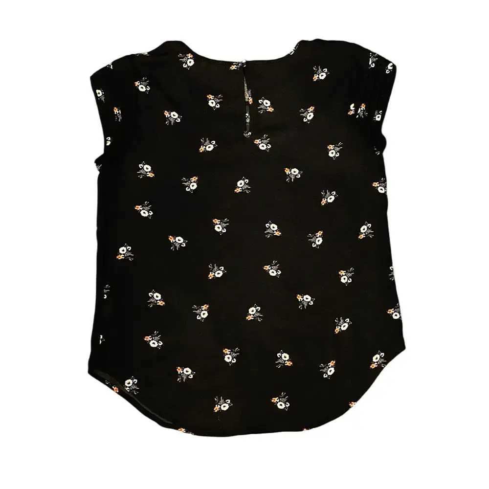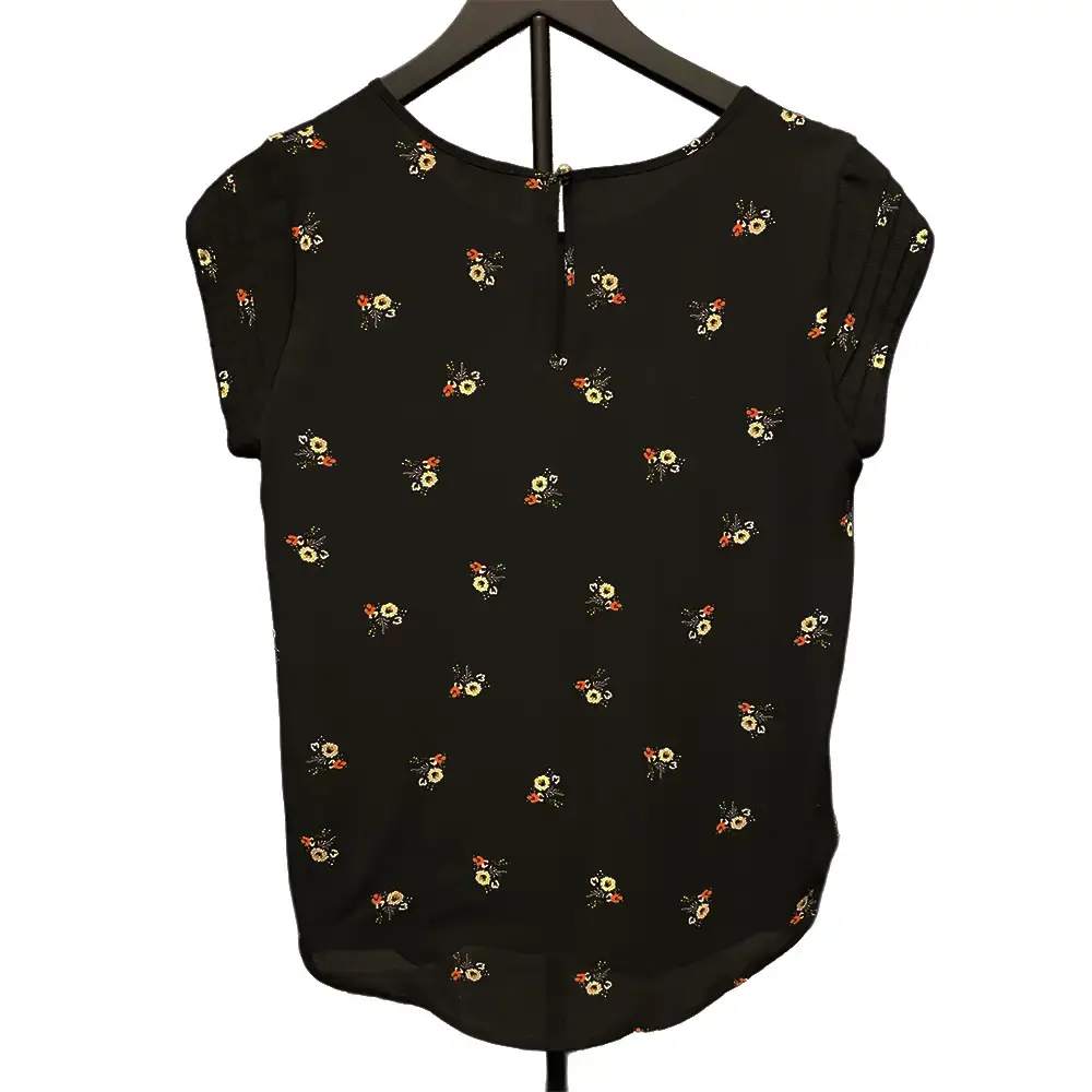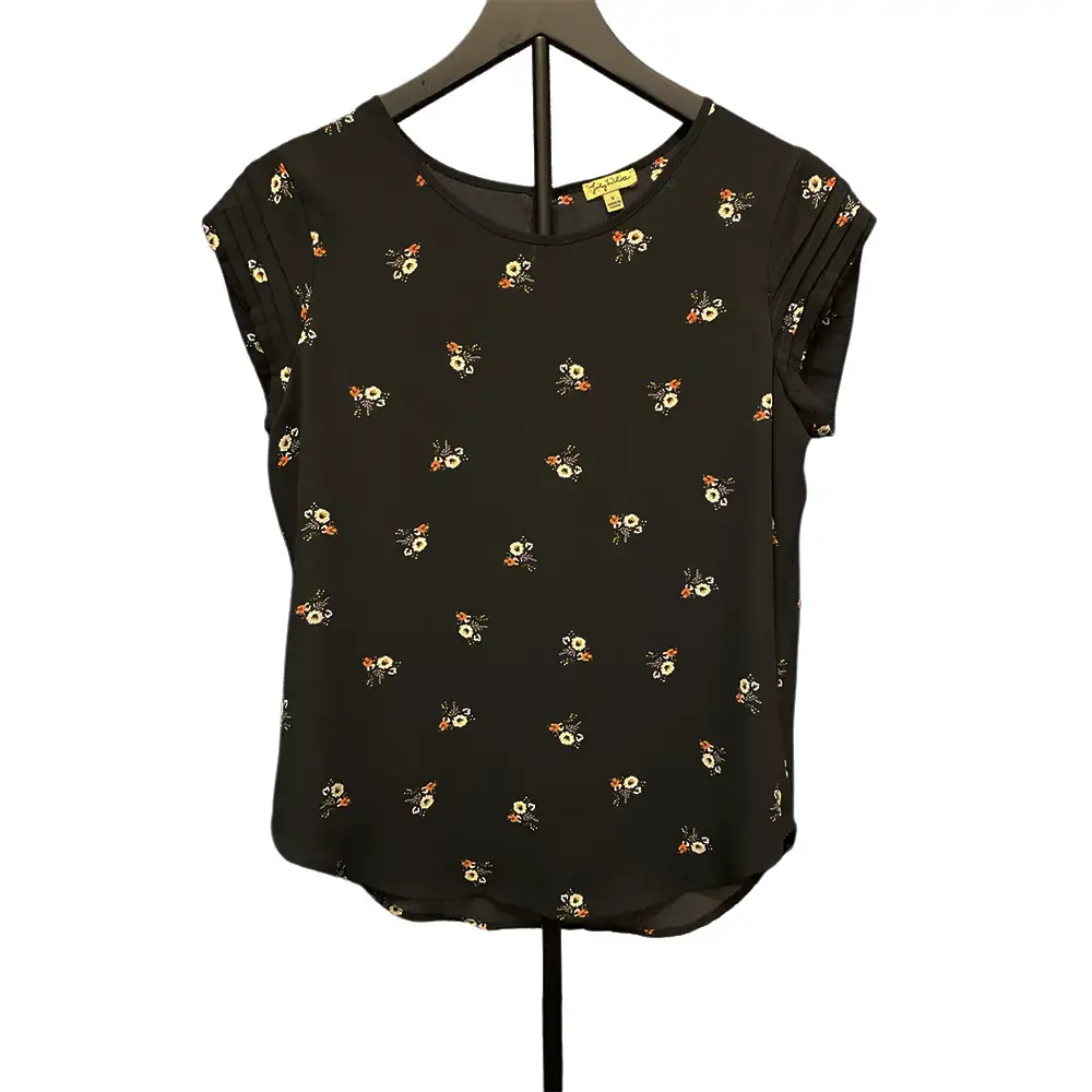 This Lily White women blouse brings a sweet touch to casual outfits. The black woven fabric is scattered with tiny floral clusters in warm tones that stand out without feeling loud. It has a crew neckline, soft cap sleeves with subtle pleats and a curved high low hem that sits nicely over leggings or denim. A small back keyhole with button closure makes it easy to pull on. Pre owned in very excellent condition with no noted flaws.