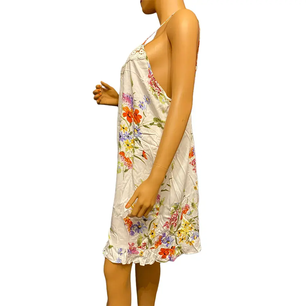 This Linea Donatella chemise brings garden party vibes to your sleepwear. The ivory base showcases a vibrant watercolor wildflower print in shades of orange, purple, pink, and yellow. Delicate crochet eyelet lace trims the V neckline for a romantic touch. Adjustable spaghetti straps in matching floral fabric and a low scoop back keep it flirty. The playful ruffle hem adds feminine movement. Lightweight rayon fabric feels cool and breezy. New with tags, never worn.