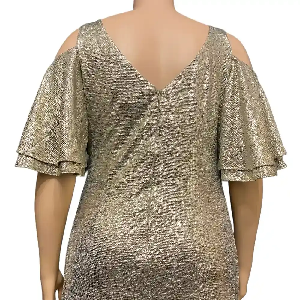 A floor-length gown with metallic shimmer in light gold. The cold shoulder design with flutter sleeves gives you coverage while showing a bit of skin. The surplice neckline and ruched detailing through the waist create a flattering fit, and the side slit keeps the long length from feeling too formal. V-back mirrors the front neckline.