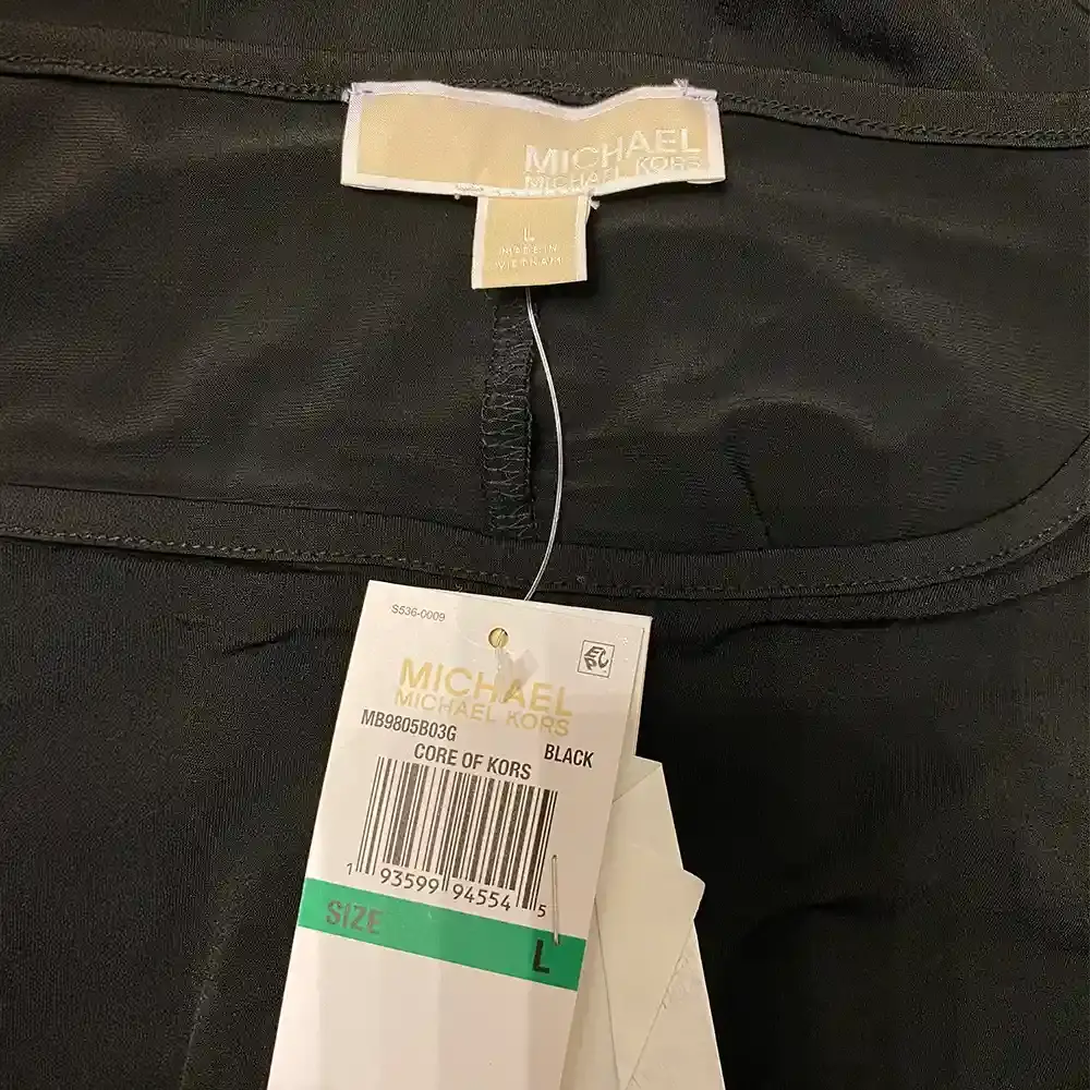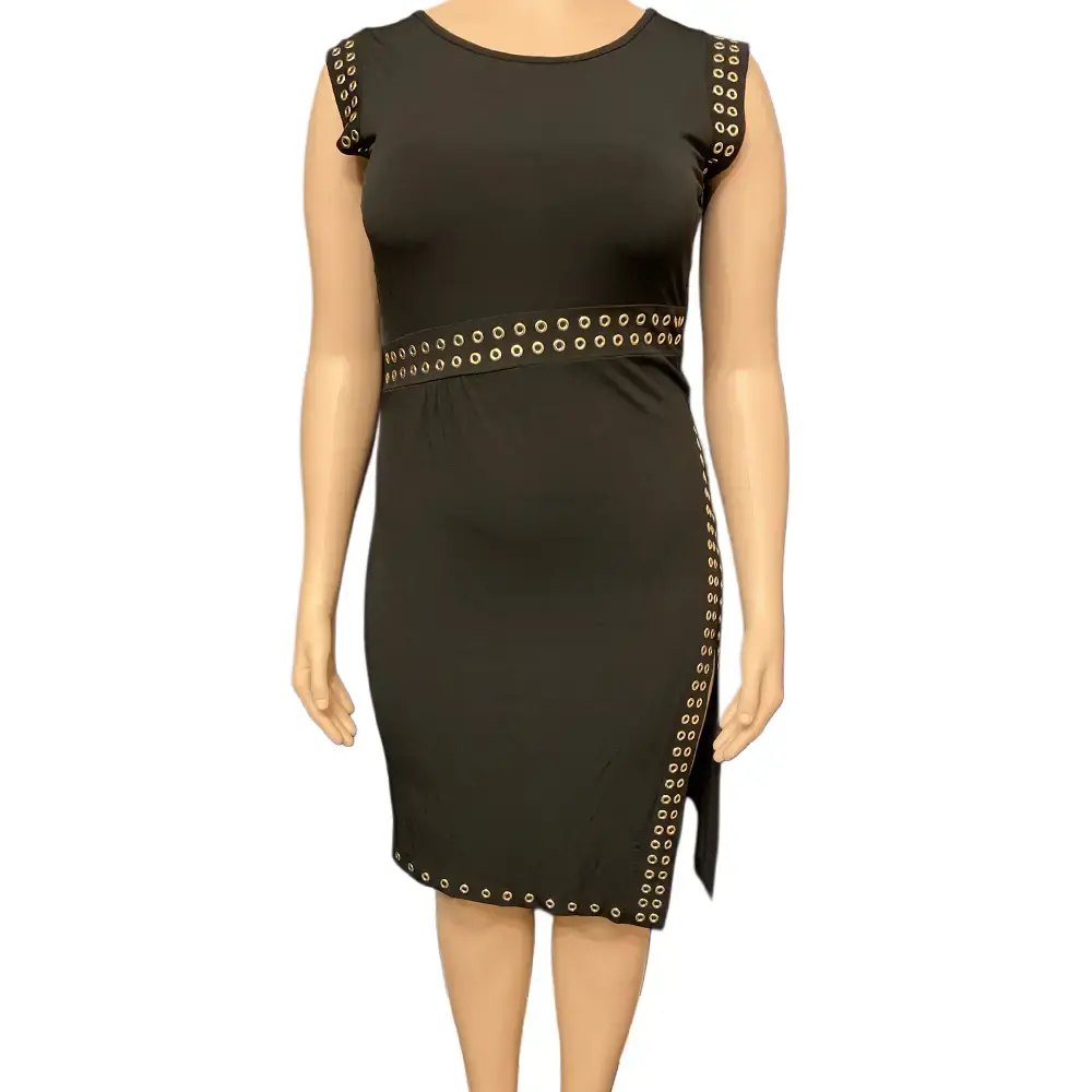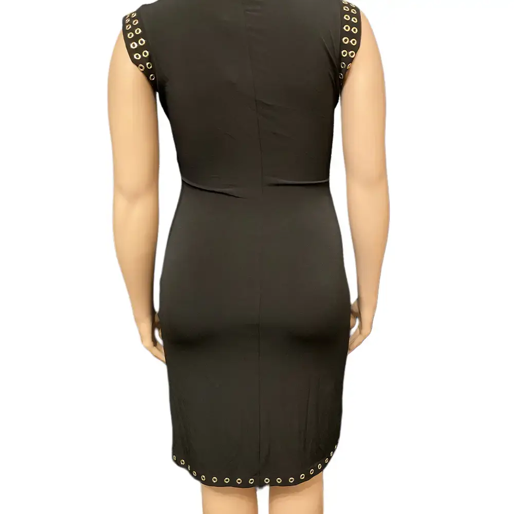 This Michael Kors Astor dress features a smooth black knit with gold tone studs framing the shoulders, waist, hem, and side slit. The fitted sheath shape and crew neckline give a clean modern finish and the stretch fabric makes it comfortable to wear. There is a small flaw at the top of the slit and light wear from store try ons as shown in the photo.