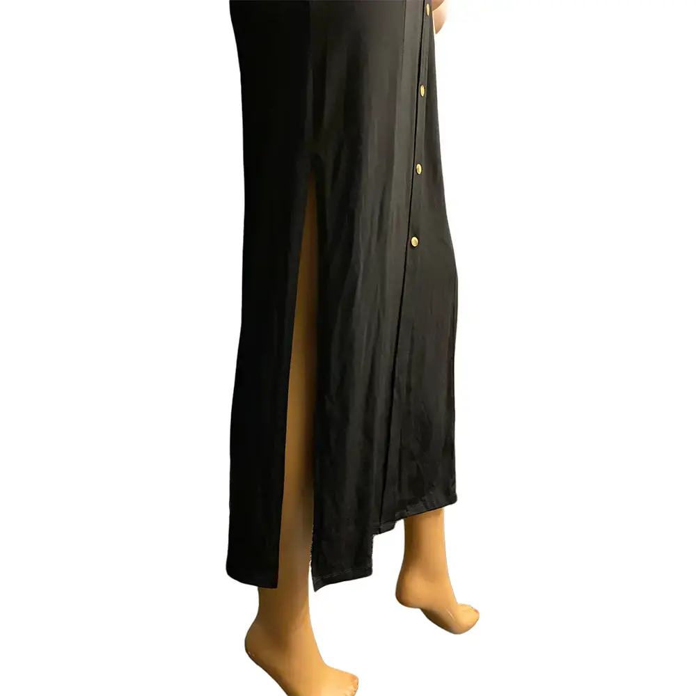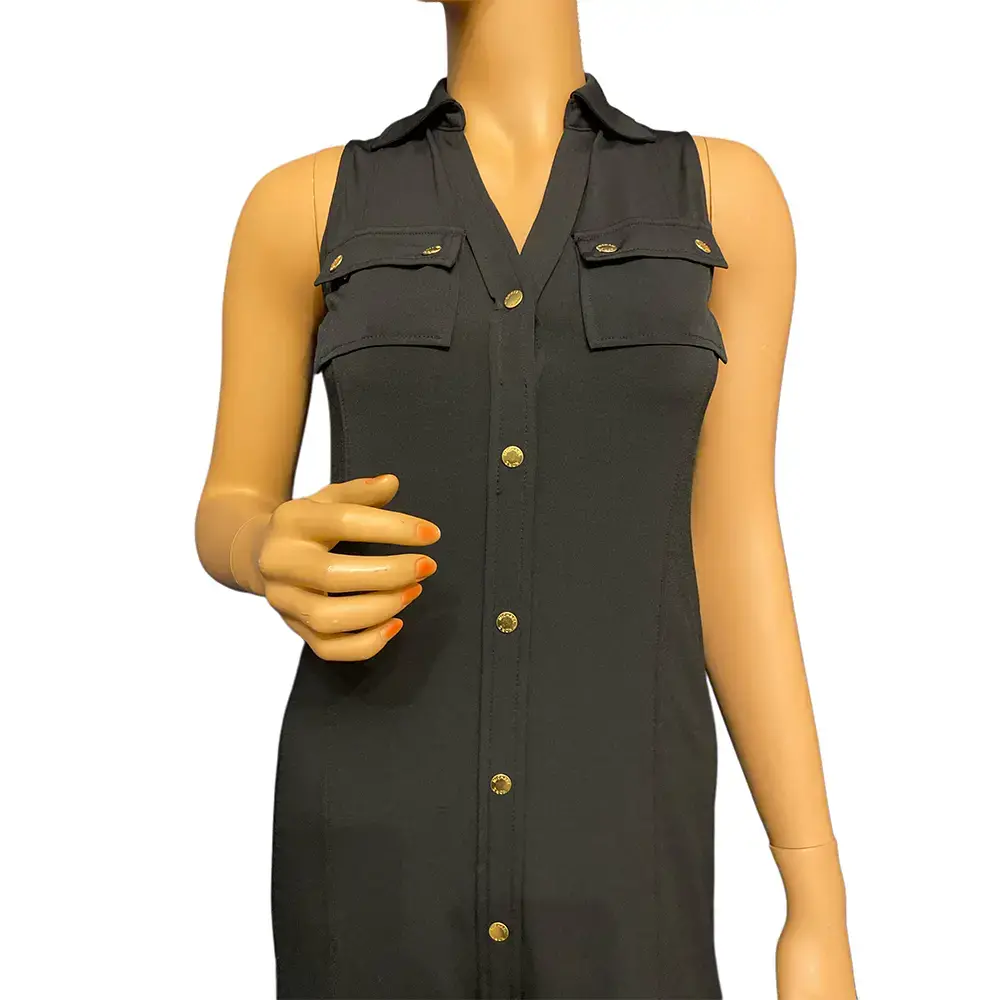 This stunning Michael Kors maxi shirtdress brings effortless style with its clean, streamlined silhouette. The sleeveless design features a sharp collar and v-neckline for a polished look. Gleaming gold button closure runs the full length of the dress while matching gold hardware accents the two button-flap chest pockets. The flowing maxi length creates an elongated silhouette while side slits at the hem allow comfortable movement. Soft stretch fabric blend drapes beautifully and moves with you throughout the day. Perfect for layering with a blazer or cardigan for cooler weather, or wearing solo during warmer months. The versatile black color transitions seamlessly from casual daytime wear to evening events. Unlined for a lightweight, breathable feel. Brand new with original tags attached.