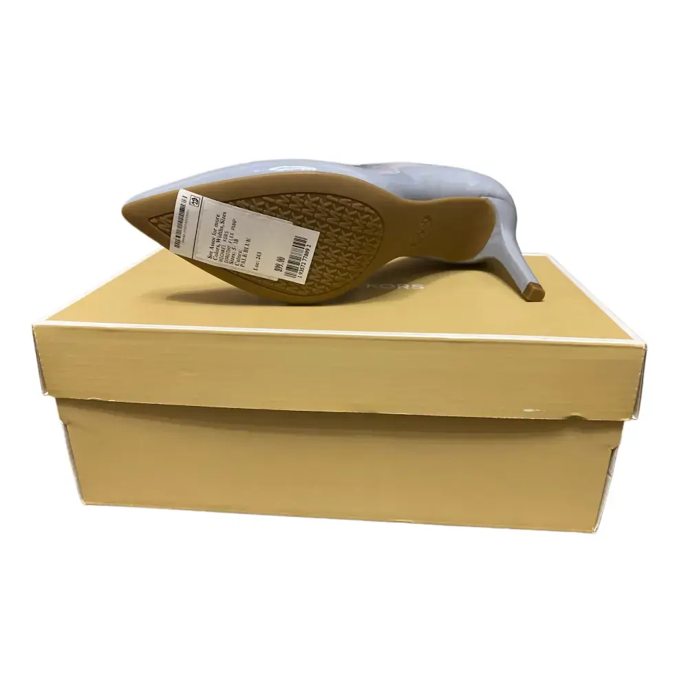 These Michael Kors Dorothy Flex pumps are a wardrobe essential in a gorgeous pale blue. The glossy patent leather catches the light beautifully while the classic pointed toe and slim heel keep the silhouette timeless. The Flex construction offers comfort for all day wear. Tan leather lined interior with embossed Michael Kors logo and gold MK stud detail at the back heel for that signature designer touch. Slip on style. Brand new with box, never worn, original sticker still on soles.