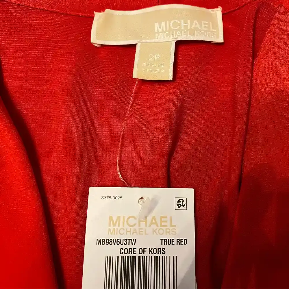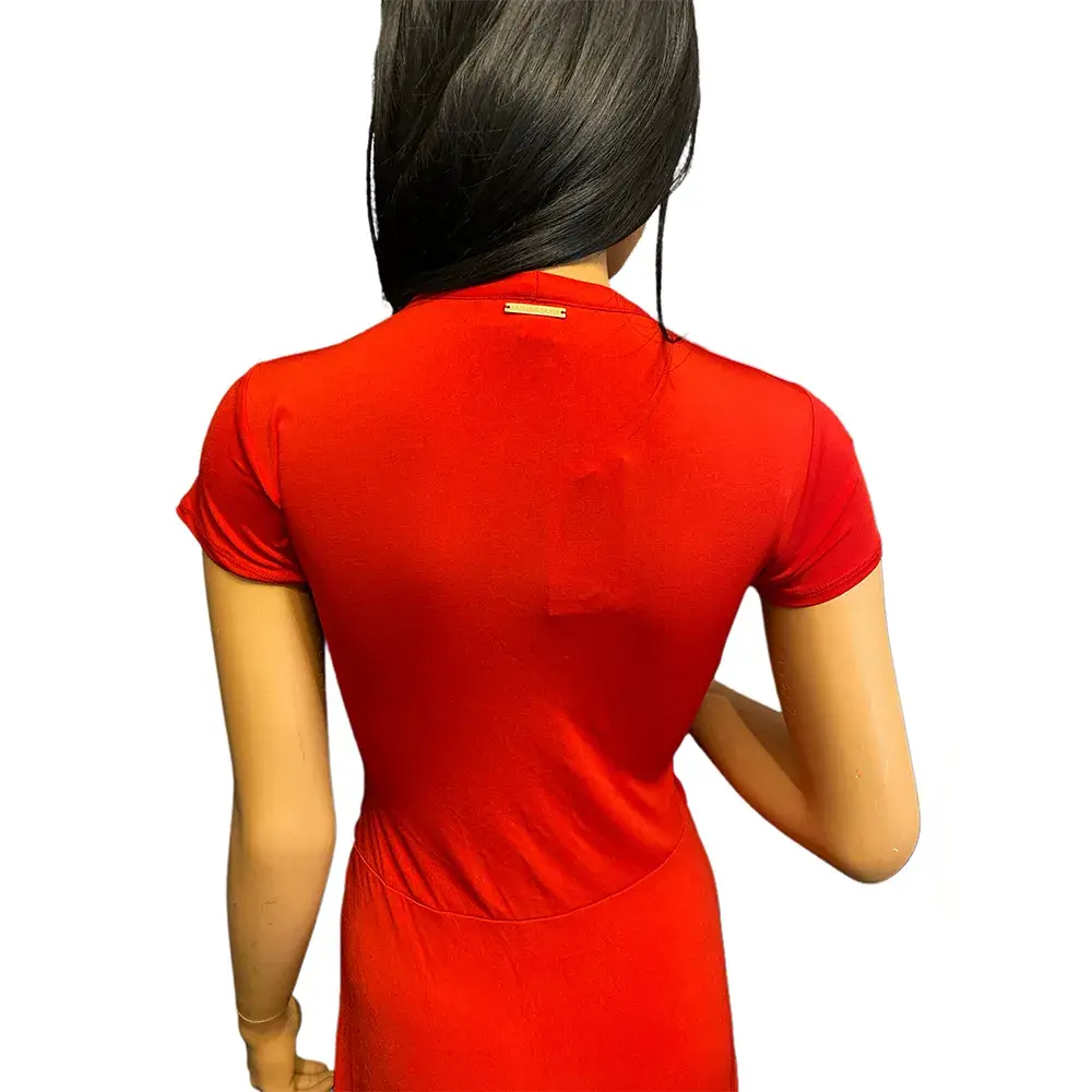 This show-stopping Michael Kors dress brings effortless glamour with its striking true red color and sophisticated faux wrap silhouette. The flattering surplice V-neckline elongates the figure while soft cap sleeves provide elegant shoulder coverage. The signature feature is the twisted front waist detail with attached self-tie sash that creates beautiful draping and cinches the waist for a defined silhouette. Dramatic high-low hemline adds movement and modern sophistication, hitting at the knee in front while gracefully flowing to ankle length in the back. Hidden side zipper closure ensures smooth lines while maintaining the wrap dress aesthetic. Gold-tone hardware detail at the back neck adds a luxe finishing touch. Soft jersey knit fabric with spandex blend offers comfortable stretch that moves with you while holding its elegant shape. The bold true red shade makes a confident statement perfect for commanding attention at any event. Petite proportions ensure the perfect fit for shorter frames. Whether you're attending a wedding, cocktail party, formal dinner, or special celebration, this versatile piece delivers sophistication with a touch of drama. Brand new with original tags attached.