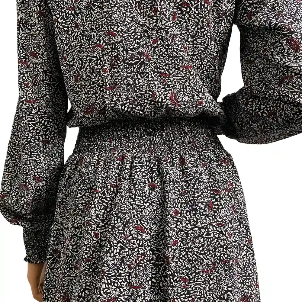 This Michael Kors dress is giving timeless elegance with a modern twist. The faux-wrap silhouette is a masterclass in flattery—it cinches at the waist to define your shape while the flowing skirt drapes beautifully and moves with you. The black crepe fabric is covered in an intricate floral-inspired pattern with rich maroon accents that add visual interest without being loud or overwhelming. It's the kind of sophisticated print that works equally well for a dinner party or a day at the office.