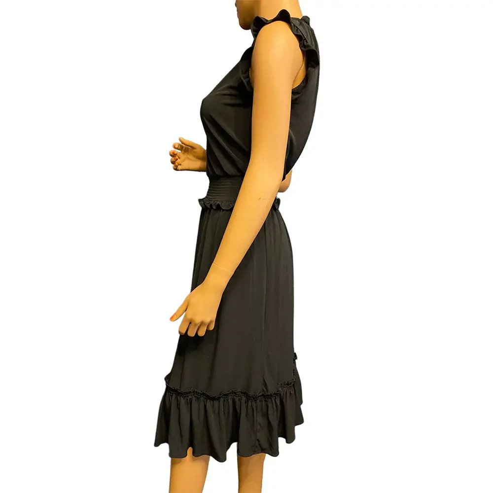 This stunning Michael Kors dress brings playful sophistication with cascading ruffle details that catch the eye at every turn. The sleeveless silhouette features a high mock neckline trimmed with delicate ruffles that frame the face beautifully. Ruffle cap sleeves add a soft feminine touch to the shoulders. The defining feature is the elasticized smocked waistband accented with coordinating ruffle trim, creating a flattering empire waist that flows into an A-line skirt. Tiered ruffle hemline adds movement and whimsy to this midi length piece. Soft stretch fabric with spandex ensures comfortable all-day wear while maintaining a polished look. The gorgeous olive green shade works beautifully across seasons and complements a variety of skin tones. Pullover styling with elastic at neck and armholes makes getting dressed effortless. This versatile piece transitions seamlessly from brunch dates to garden parties to evening cocktails. Simply pair with sandals for daytime or dress up with heels and statement jewelry for special occasions. Brand new with original tags attached.