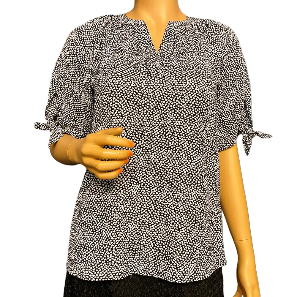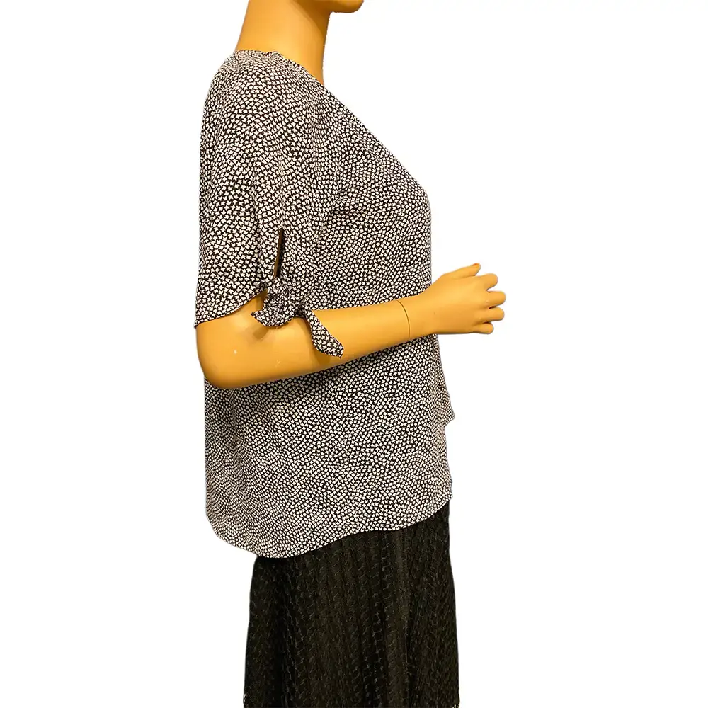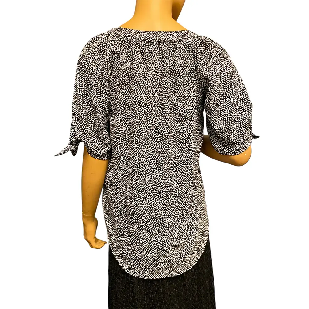This Michael Michael Kors blouse is an easy, polished top that pairs with everything. The all-over black and white micro print gives it a classic look while the split neckline and elbow length sleeves with knotted tie detail add a feminine touch. The relaxed silhouette with a curved hem makes it great tucked into trousers or worn loose over jeans. A versatile wardrobe staple from a designer brand. Excellent pre-owned condition with no flaws.