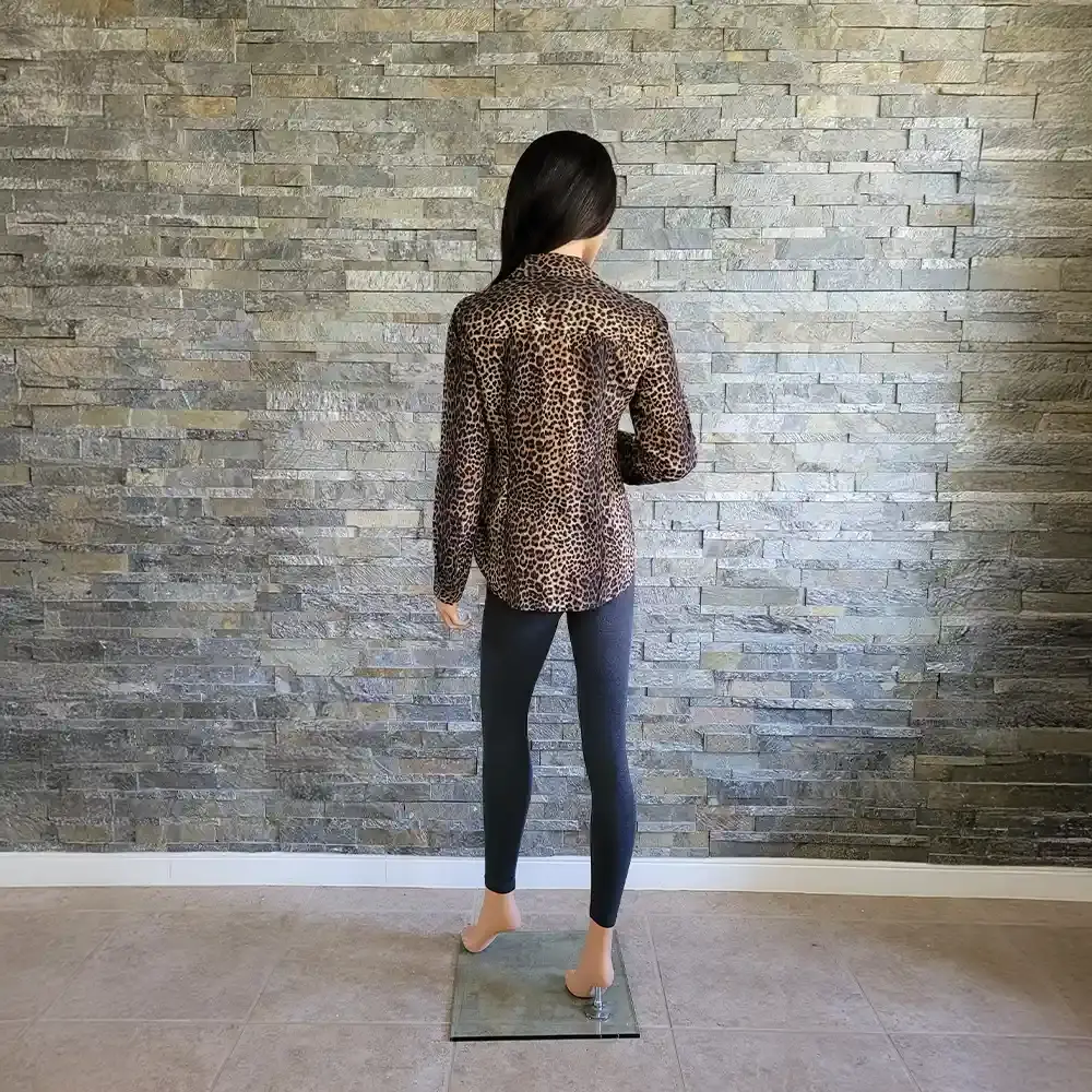 This MICHAEL Michael Kors top makes leopard print look polished. The fitted silhouette and structured details like the point collar and chest pockets give it more of a shirt jacket feel than a basic blouse. Full zip front with signature MK logo hardware adds a modern touch. Long sleeves with button cuffs can be worn down or rolled up for a more casual look.