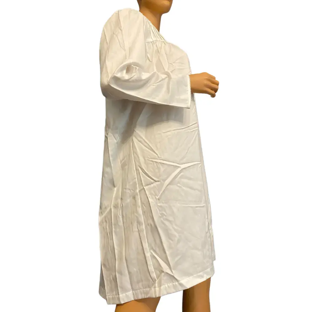 Classic white nightgown from Miss Elaine with embroidered floral yoke. Round neckline with lace trim, button front, long sleeves. Knee length. Size Medium. New with tags.