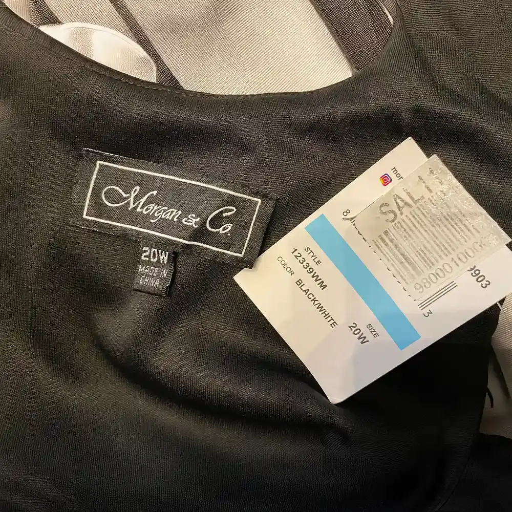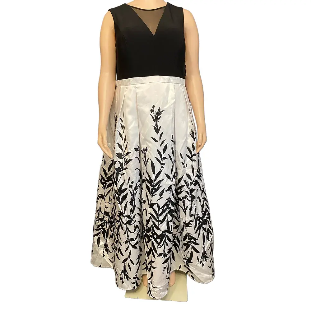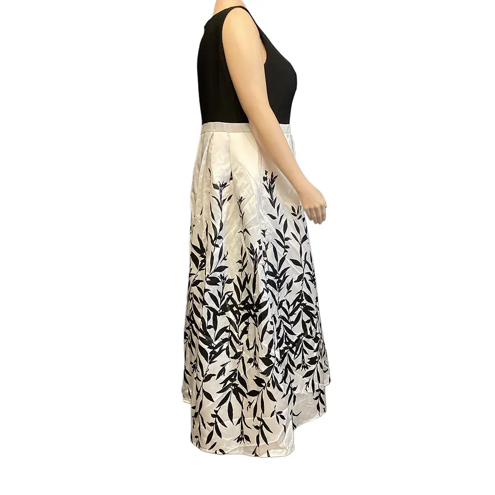 This Morgan & Co black and white prom dress delivers classic formal style with a flattering fit for plus sizes. The bodice features a solid black sleeveless design with a mesh inset V neckline and a smooth, tailored waist that defines your shape. Below, the full-length ivory skirt showcases a striking black leaf print that begins near the hips and deepens toward the hem for an elegant, grounded look. The skirt is fully lined for coverage and includes hidden side pockets, adding function without sacrificing style.