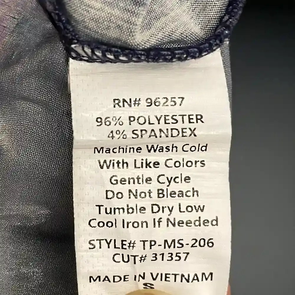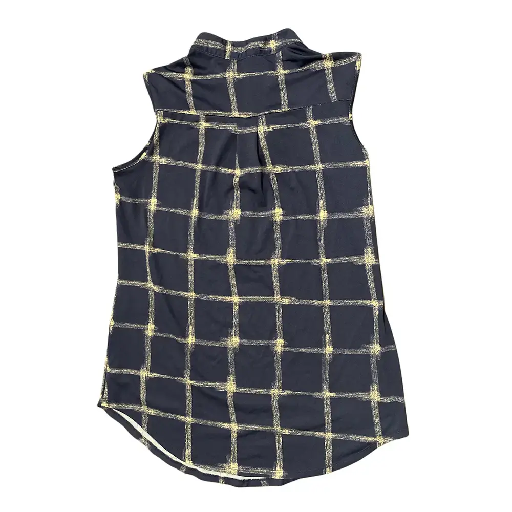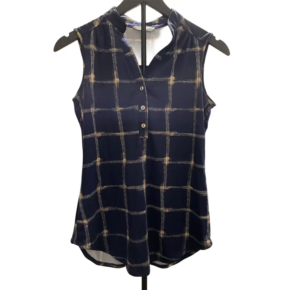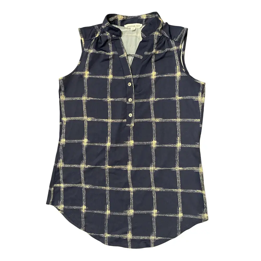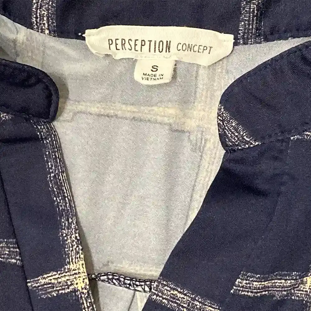 This PerSeption Concept women top brings a polished touch to everyday outfits. The navy base is covered in a brushed windowpane pattern that feels modern but still playful. A short button placket and gentle stand collar frame the neckline while the curved hem adds a relaxed finish that looks good worn loose over jeans or leggings. The stretch woven fabric is smooth and comfortable for all day wear. Preowned and in excellent condition.