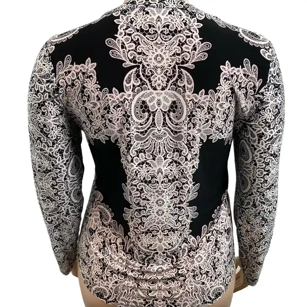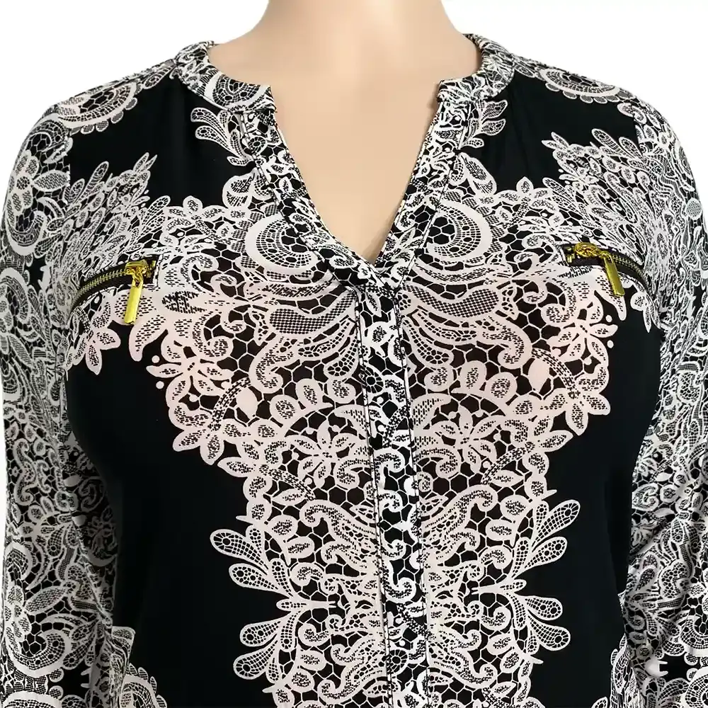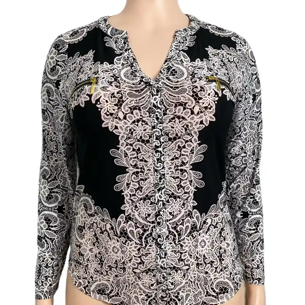 This INC International Concepts blouse has an ornate lace print that looks way more expensive than it is. The white pattern against the black base creates a Victorian-inspired look that works for both dressy occasions and elevated everyday wear. The intricate lace design covers the entire top in a symmetrical pattern that flatters without overwhelming.