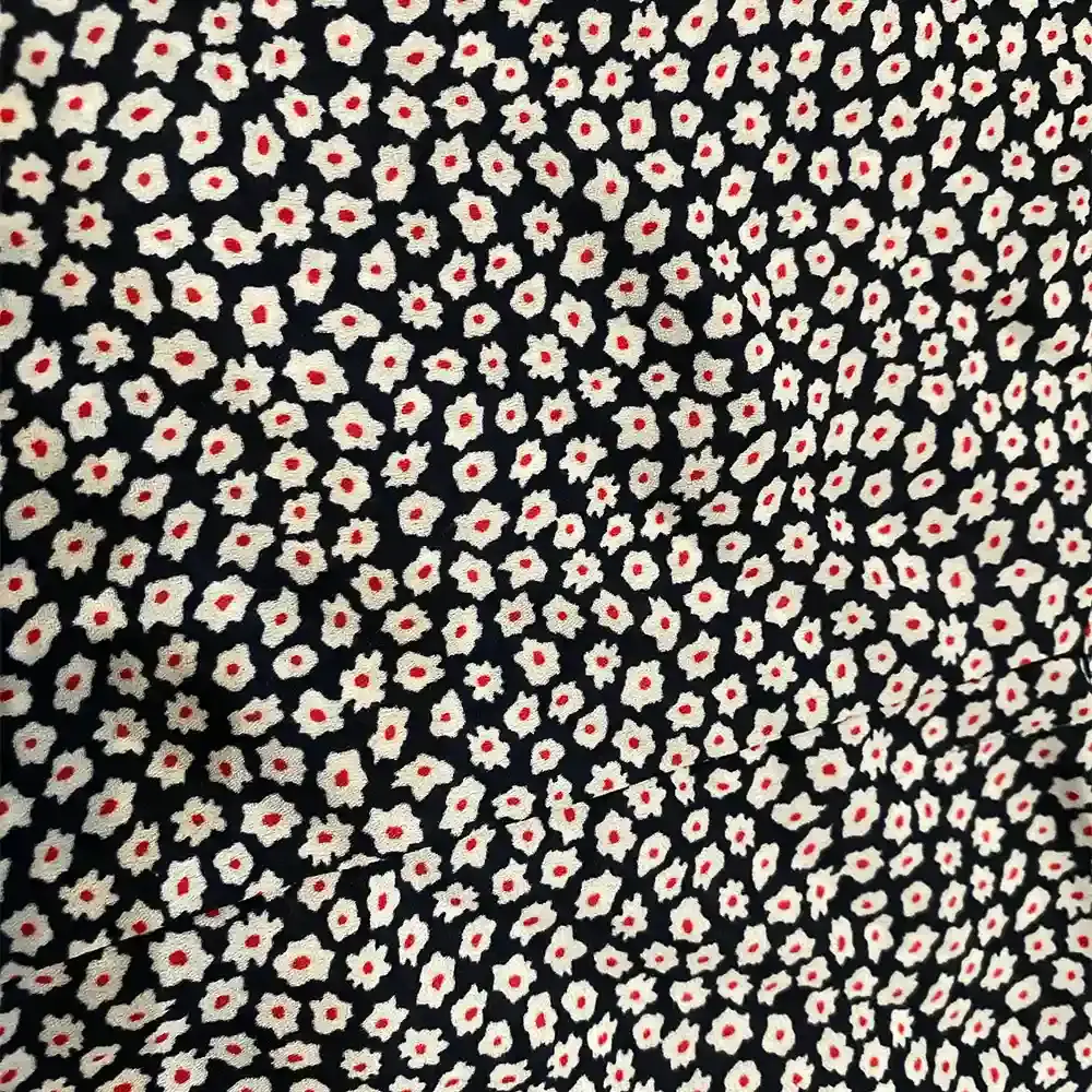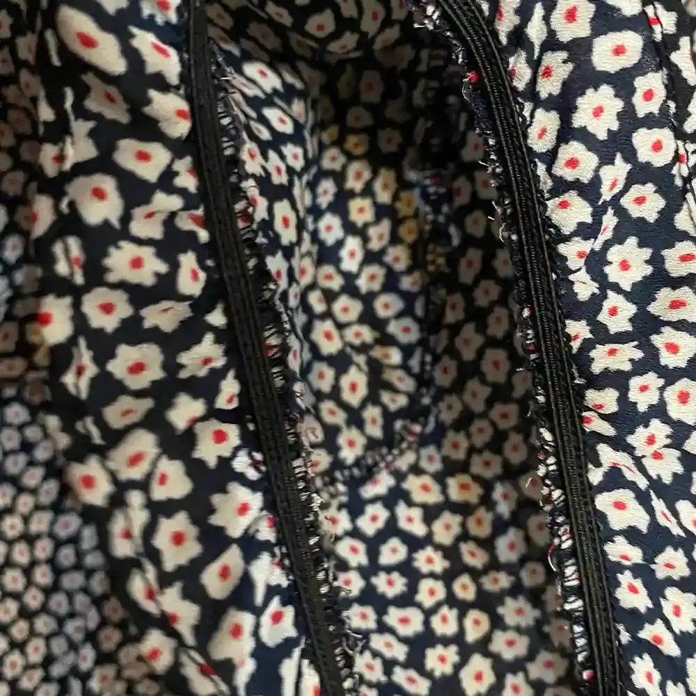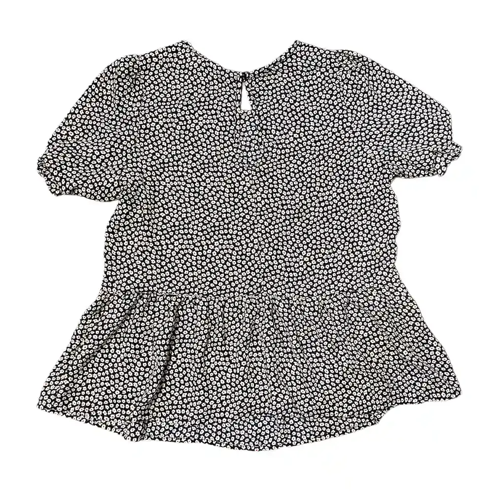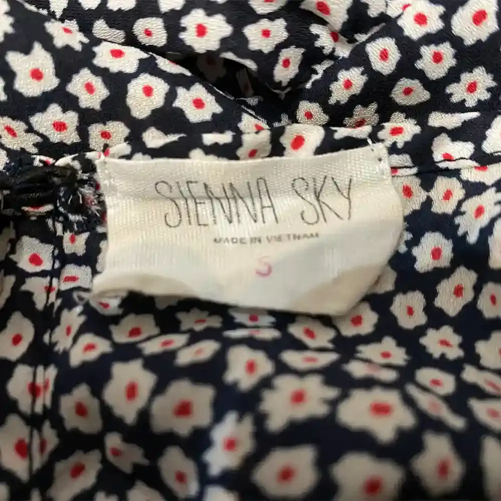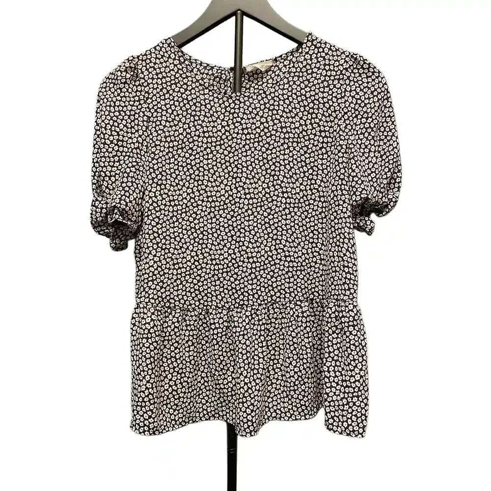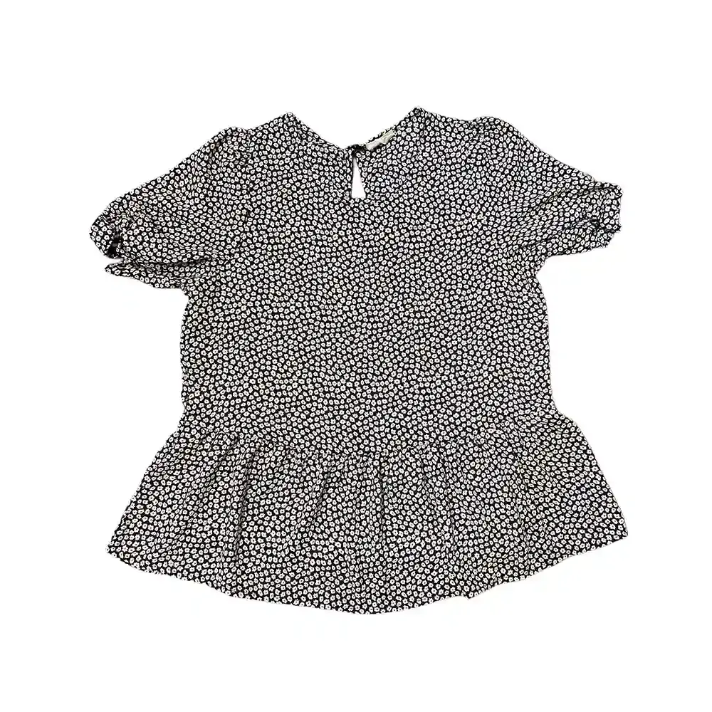 This Sienna Sky blouse is a sweet and easy piece for everyday wear. The navy fabric is covered in tiny cream flowers with red centers that give it a soft ditsy floral look. The top has short puff sleeves with gentle elastic at the cuffs, a relaxed bodice, and a peplum style hem that adds a little flare over jeans, shorts, or skirts.