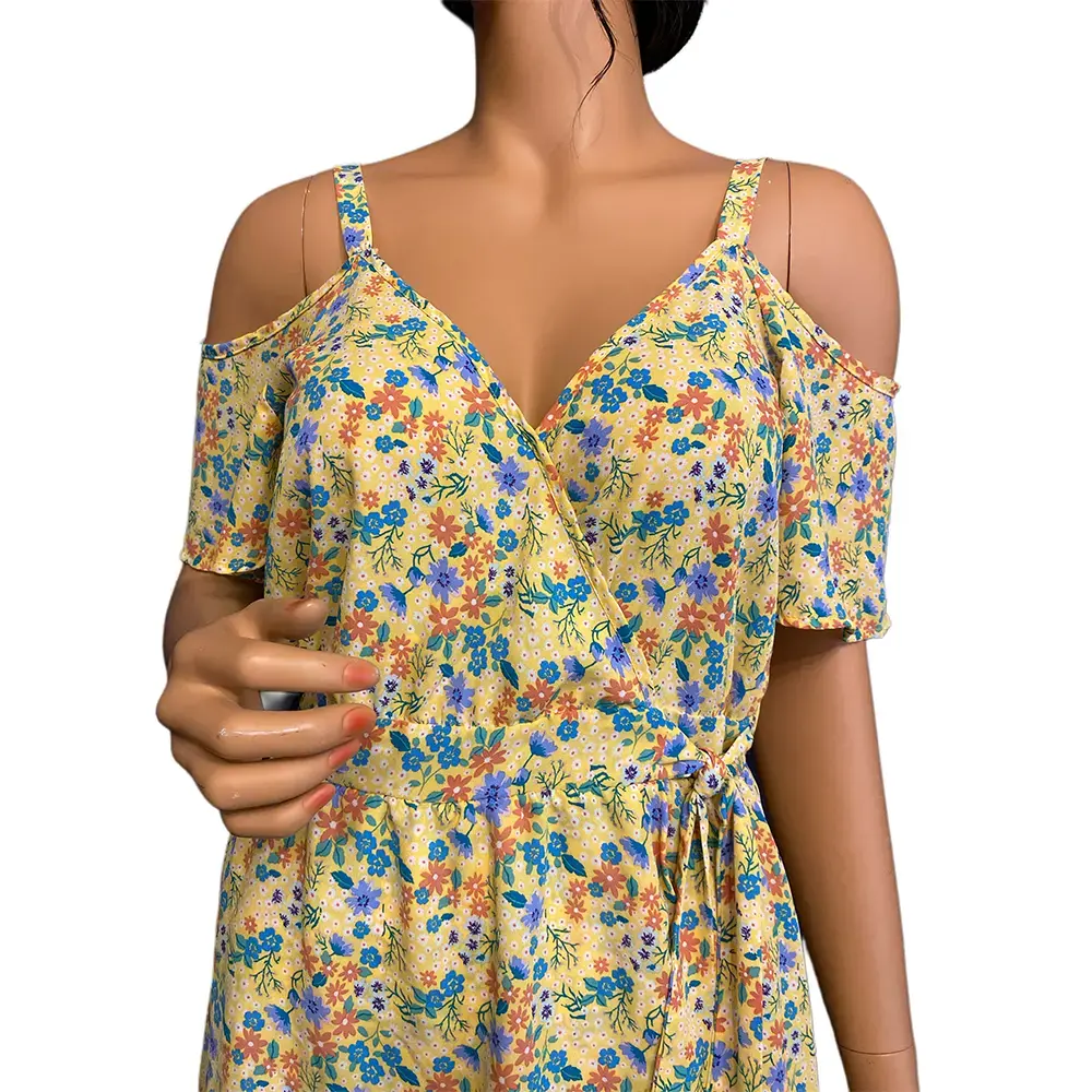 - Sleeve Style: Cold shoulder with flutter sleeves and slim straps