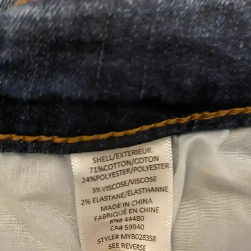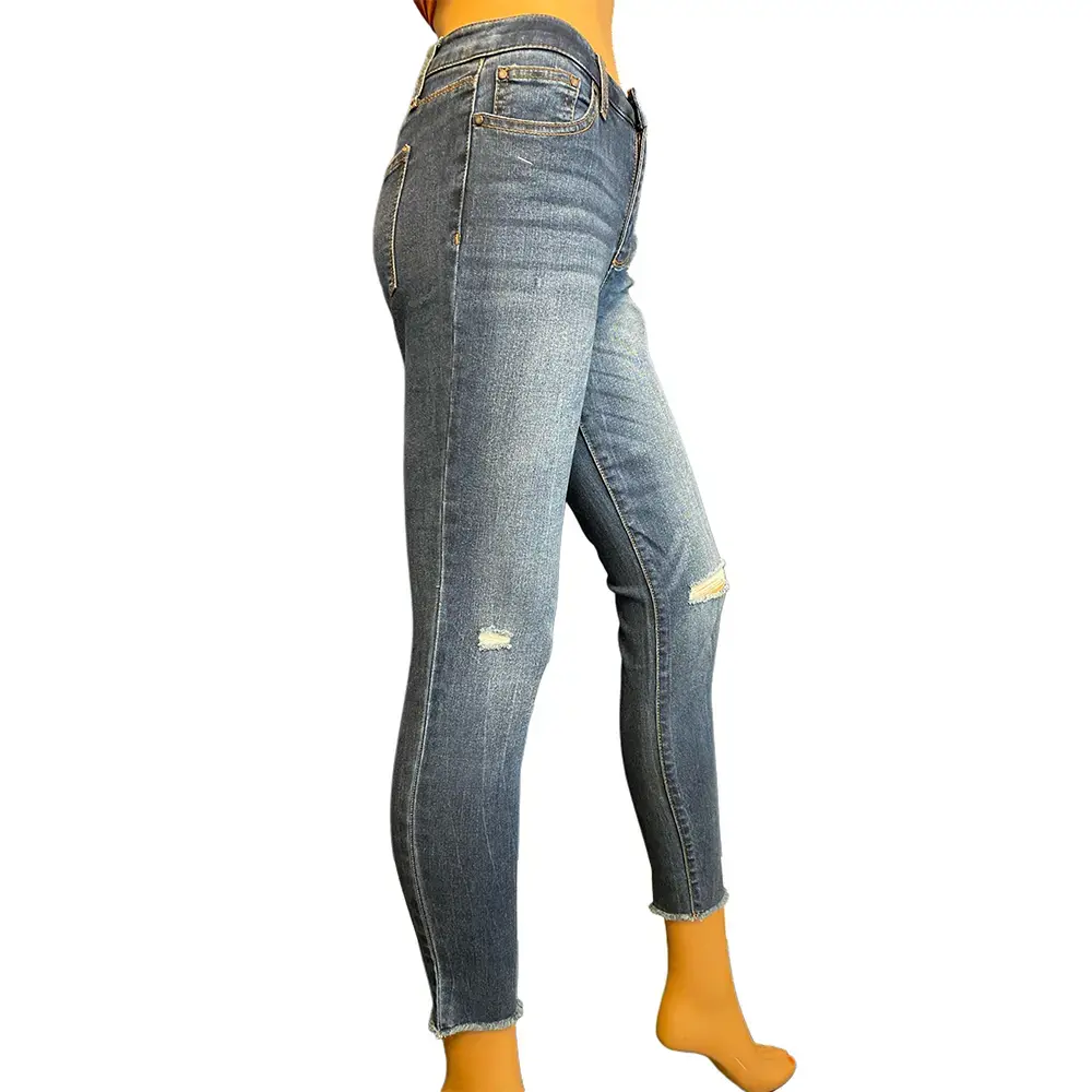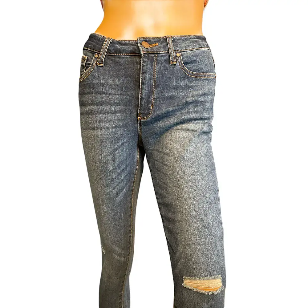 - Details: Distressed knee on left leg, whisker fading, raw frayed hem, five pocket styling