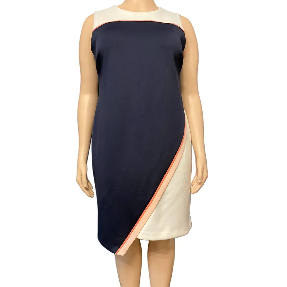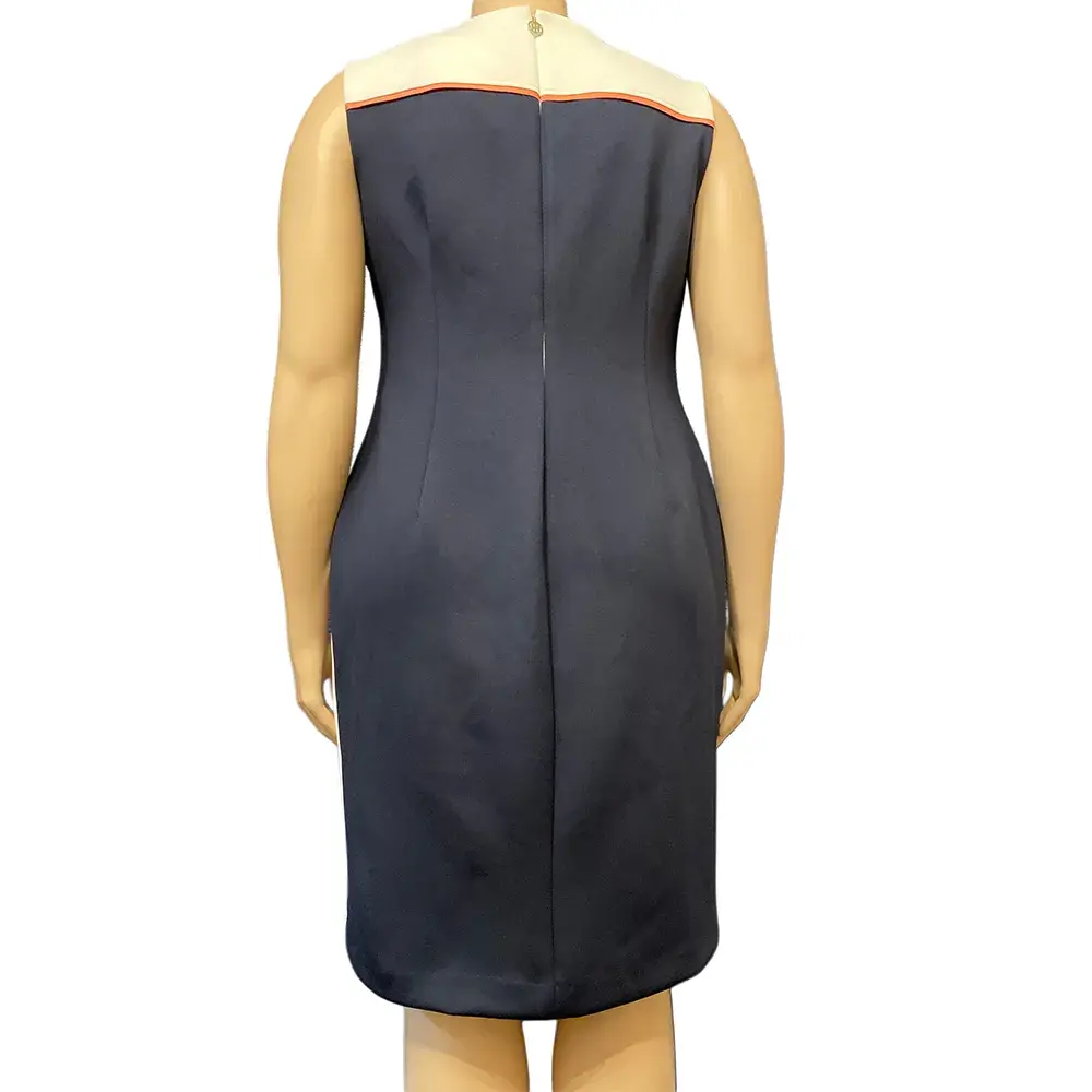 This Tommy Hilfiger dress delivers polished style with its eye catching color blocked design. Navy forms the main body while a white at the neckline and asymmetric panel at the hem create beautiful contrast. Coral and blush piping outlines the color blocking for a sporty yet refined touch. The sheath silhouette fits close to the body through the chest, waist, and hips for a flattering shape. Scuba crepe fabric provides stretch and support while maintaining structure. Round neckline keeps the look classic. Sleeveless design works perfectly for warm weather or layering under a blazer. Back zipper closure for easy dressing. Fully lined for a smooth finish. A versatile piece for the office, special occasions, or anywhere you want to make a polished impression. Note: this dress is new with a store replacement tag but has some minor color transfer marks on the white sections that may come out with dry cleaning. Please review all photos carefully.