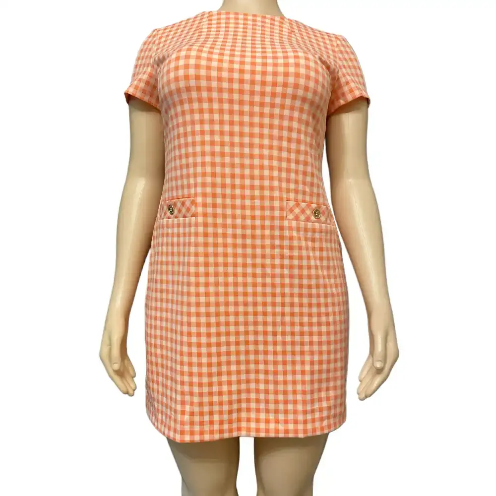 This Tommy Hilfiger dress delivers timeless preppy style with its fresh gingham check pattern. The pink and white print feels perfect for warm weather occasions from brunches to garden parties. Clean boat neckline sits elegantly across the collarbone while cap sleeves keep the look polished. Two front faux pockets sit at the hip with diagonal pattern placement and gold logo buttons adding subtle designer detail. The shift silhouette skims the body without clinging, creating an easy, comfortable fit. Back zipper with hook and eye closure ensures smooth lines. Soft stretch fabric blend moves with you throughout the day. Midi length hits below the knee for versatile styling. Pair with sandals for casual outings or elevate with heels for special events. Item may appear a different color or shade based on photography and perception.