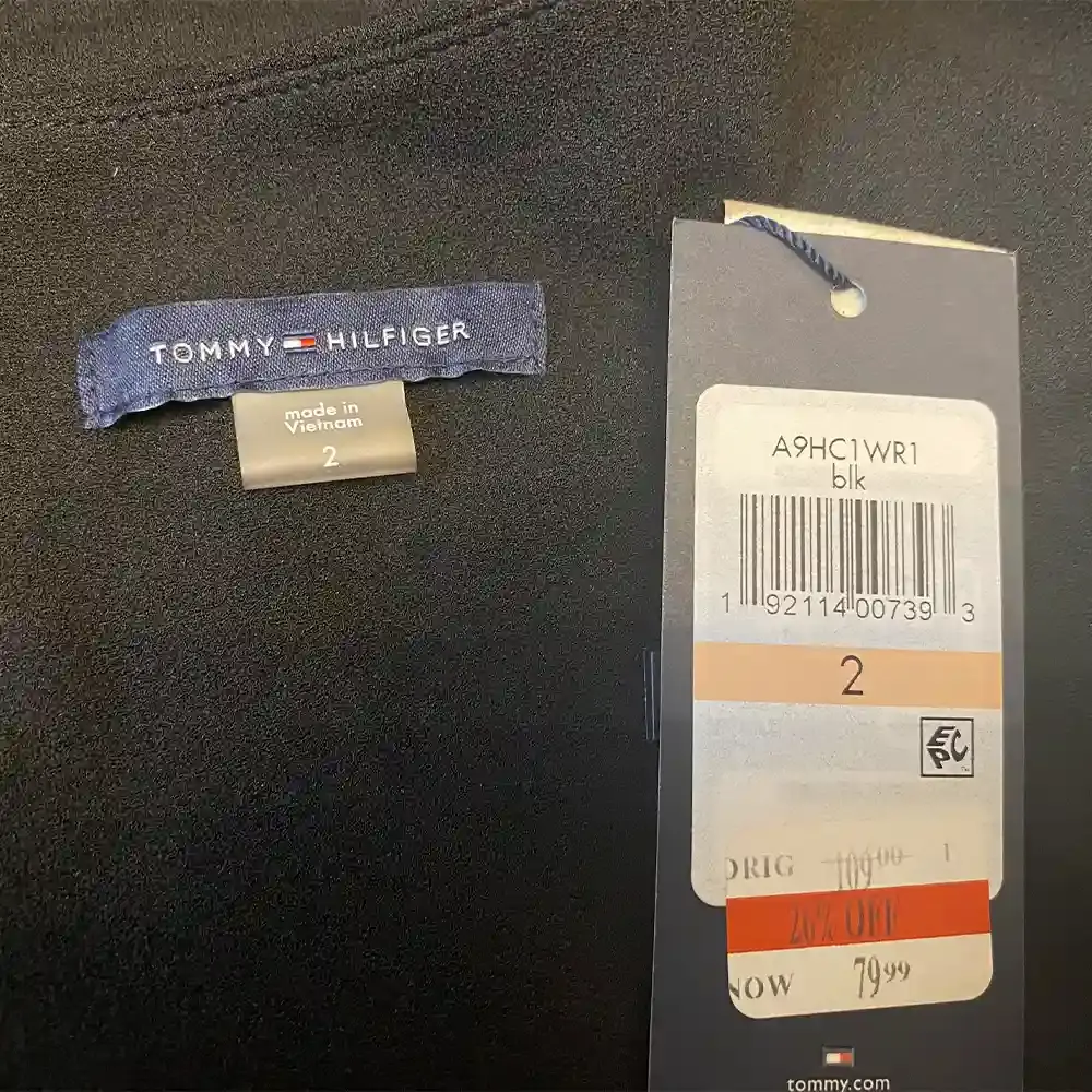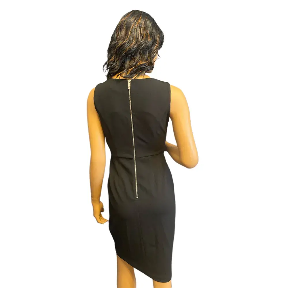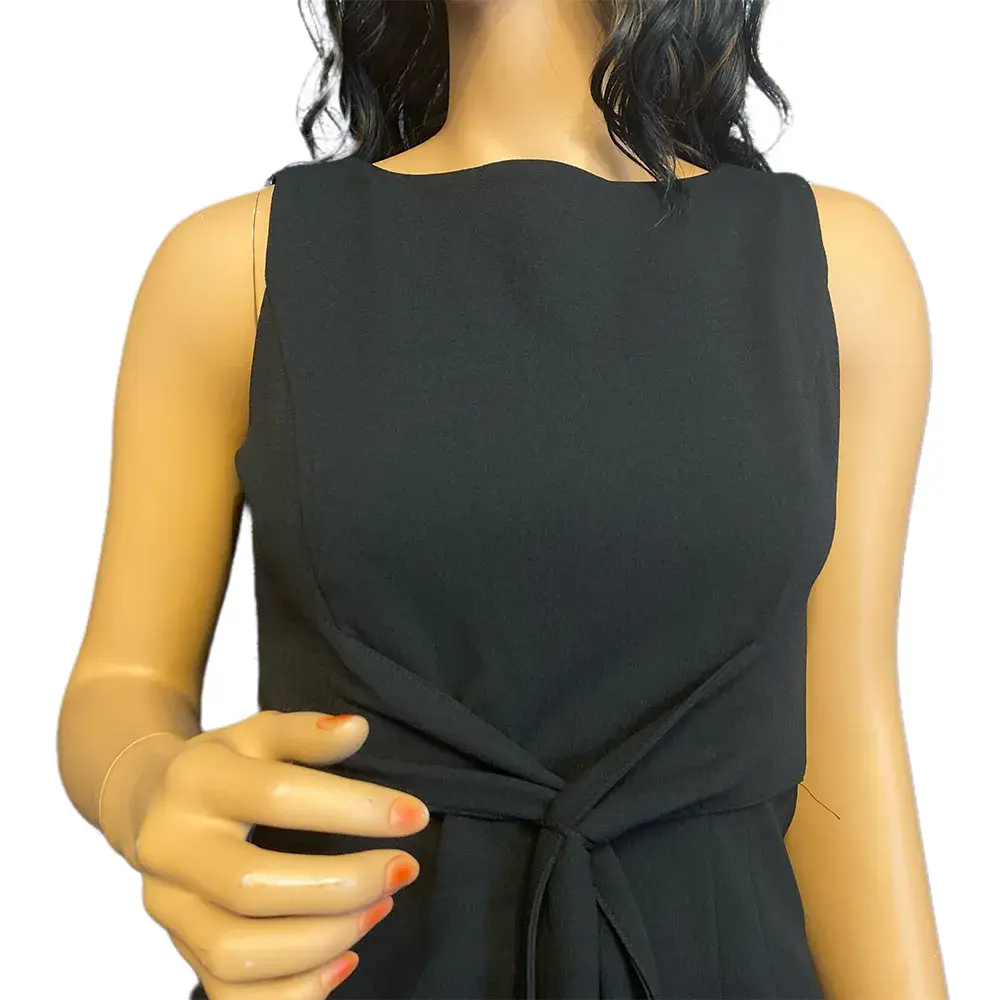 This Tommy Hilfiger dress elevates the classic little black dress with thoughtful details. The sleeveless bodice features a sophisticated boat neckline with delicate scalloped edge trim for feminine appeal. At the waist, an attached tie belt cinches for a flattering defined silhouette while square rhinestone accents on the belt ends catch the light beautifully. The fitted sheath skirt creates a polished streamlined shape that hits below the knee. An exposed gold tone zipper runs the full length of the back adding contemporary hardware detail. Smooth stretch fabric provides comfortable movement while maintaining a structured professional look. Perfect for office presentations, after work events, cocktail parties, or any occasion calling for sophisticated style. Brand new with original tags attached.