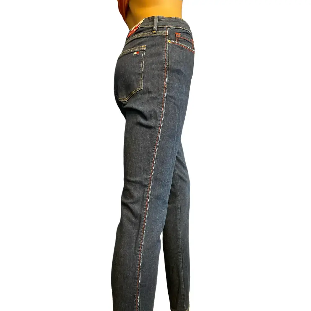 These Tommy Hilfiger Tribeca skinny jeans give you a clean dark wash with subtle embroidered flag details and contrast stitching. The high rise sits securely on the waist, while the stretch denim and slimming pocket design help lift and shape your curves. Easy to dress up or down, they are a comfortable everyday pair. New with tag.